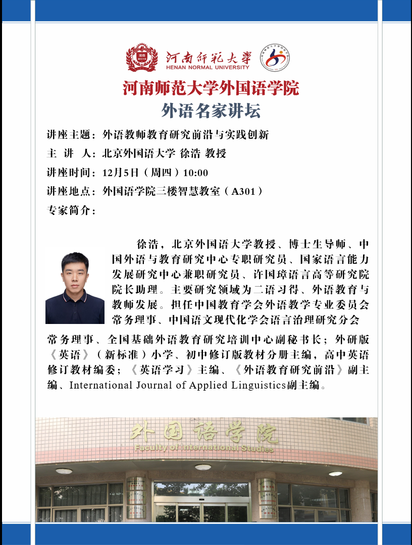 【预告】外语名家讲坛:外语教师教育研究前沿与实践创新 北京外国语大学 徐浩 教授