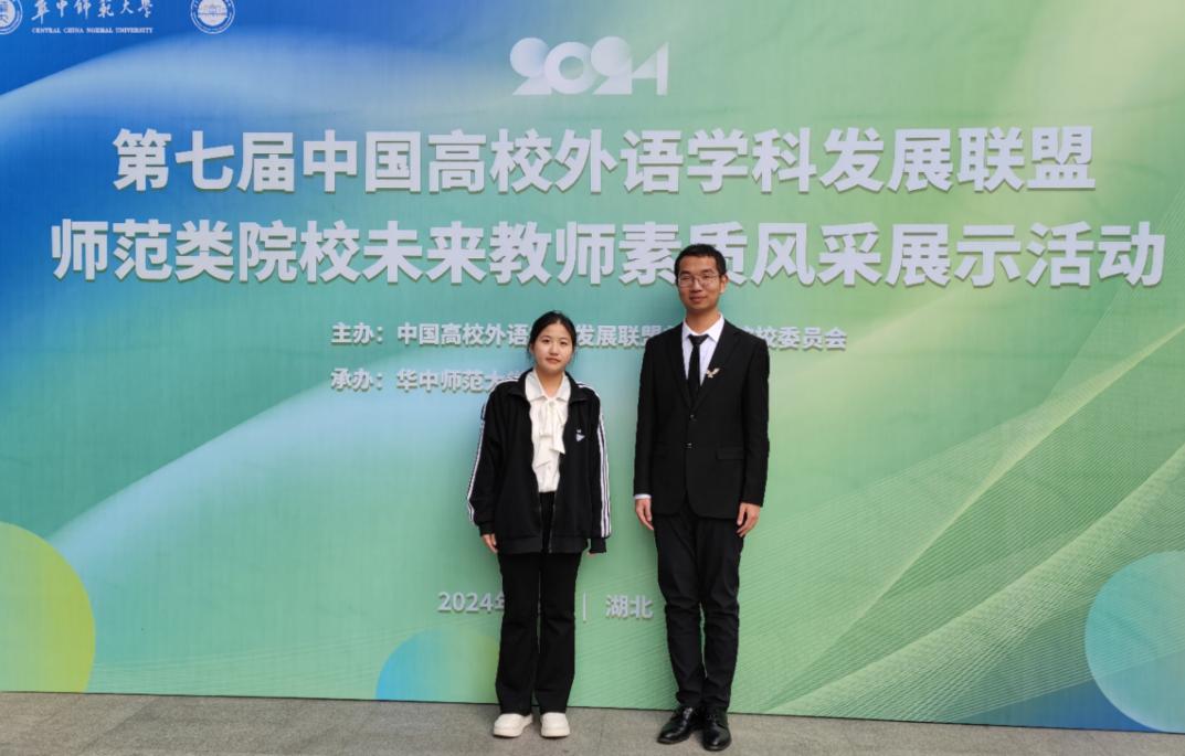 12月7日—8日,“第七届中国高校外语学科发展联盟师范类院校未来教师素质风采展示活动”在华中师范大学举行。本次活动共吸引全国41所师范院校的80名优秀选手参与,经过教案设计、教学展示、才艺展示等环节的比拼,最终我院2021级英语专业殷成颖和2022级英语专业刘洪池分别荣获二等奖和三等奖,卢星荣获“优秀指导教师”荣誉称号。