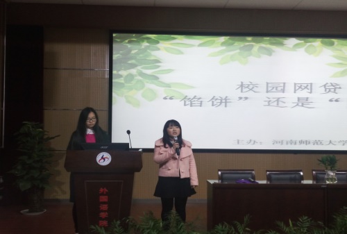 11月13日晚,外国语学院于学术报告厅举办以“校园网贷是馅饼还是陷阱”为主题的报告会。外国语学院2015级辅导员岳精精主持此次报告会。2015级、2016级学生干部及部分同学共近百余人聆听此次报告。