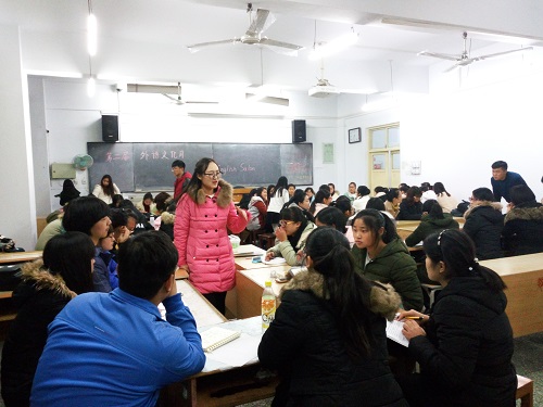 活动分为话题交流、授课、游戏、趣配音、学习交流会五个环节且每周都有固定话题。活动伊始,由负责人将学生随机分为若干组,每组均有一名优秀授课老师进行交流指导。小组成员围绕话题进行讨论,或凝眉沉思,或放声辩论。授课老师也通过各种方法提高学生的兴趣,有的以唱歌的形式,有的以配音的形式,还有以游戏的形式。寓教于乐,活动氛围积极活跃。活动最后,老师组织学员开展学习交流会,交流学习问题,分享学习经验。