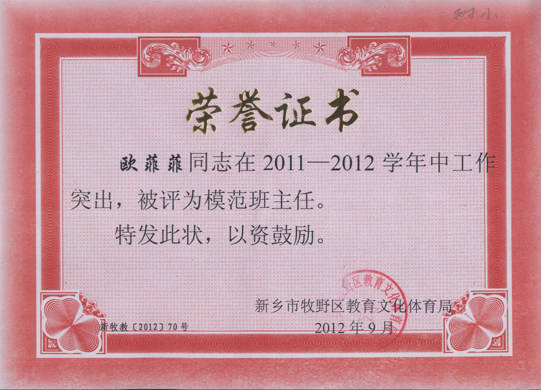 户婕、欧菲菲老师被评为牧野区模范班主任