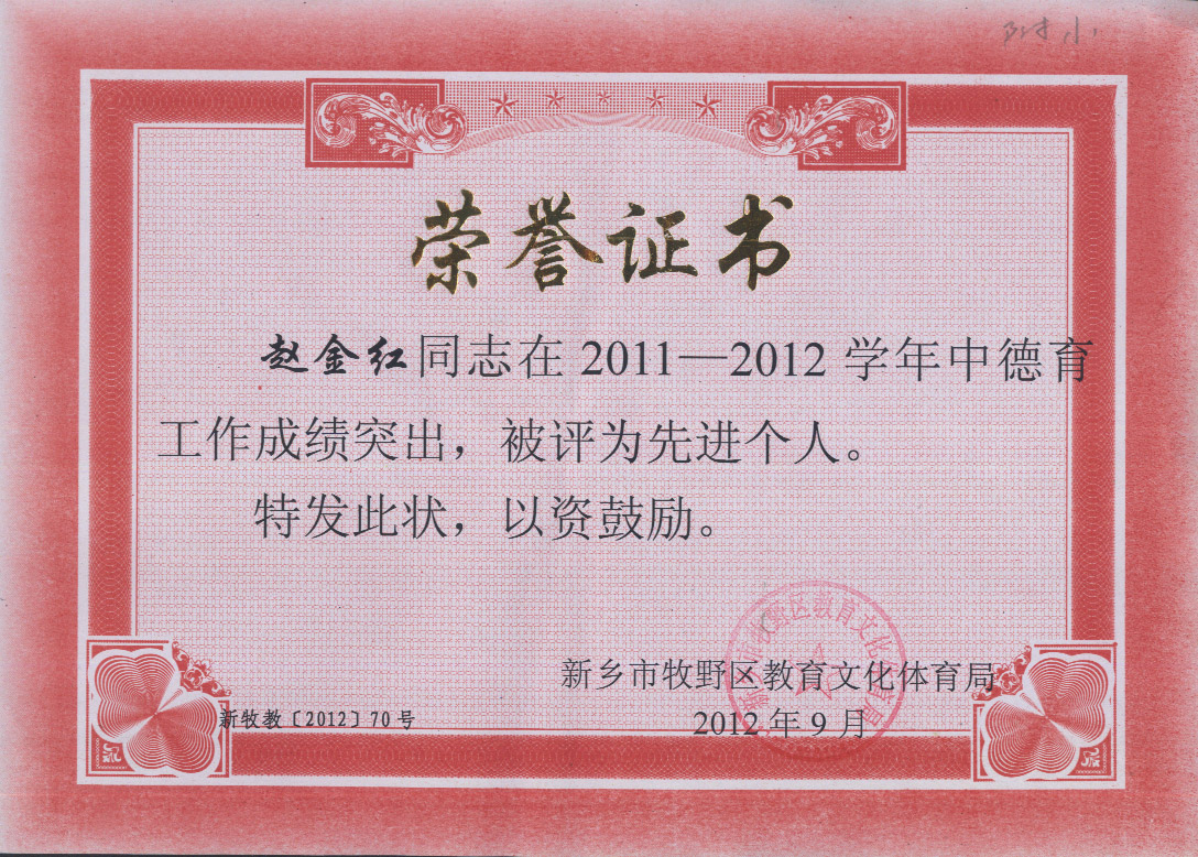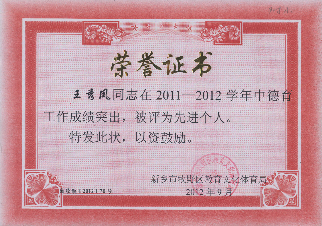 近日,牧野区教育局表彰了一批优秀班主任和德育工作先进个人,我校老师户婕、欧菲菲、王秀凤、赵金红分别获表彰。这些老师在平凡的工作中倾注了全部的爱,她们爱工作、爱学生,默默地奉献着,为附小的教育事业上作出突出了贡献。