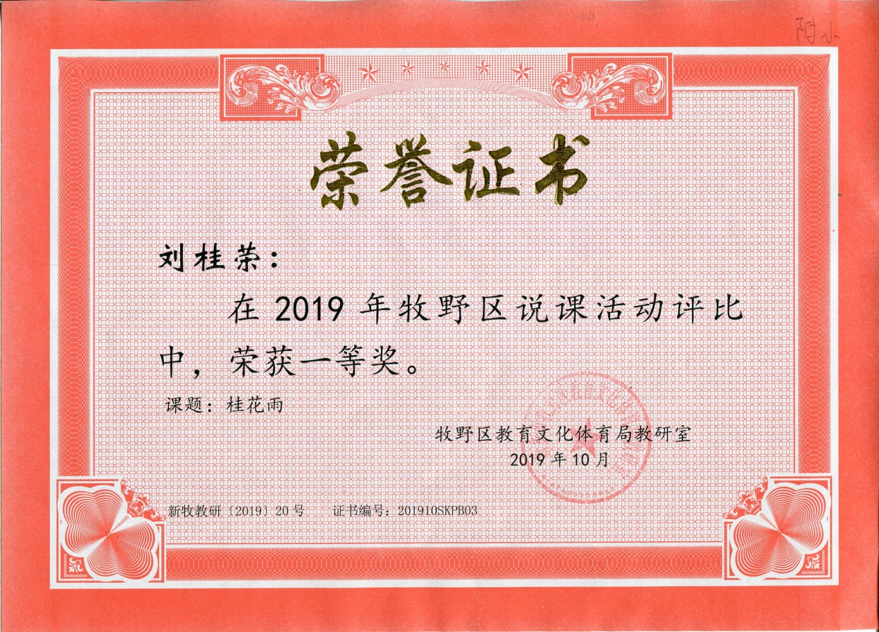 月,在牧野区说课活动评比中,我校刘桂荣老师的六年级语文《桂花雨》一课,荣获一等奖。