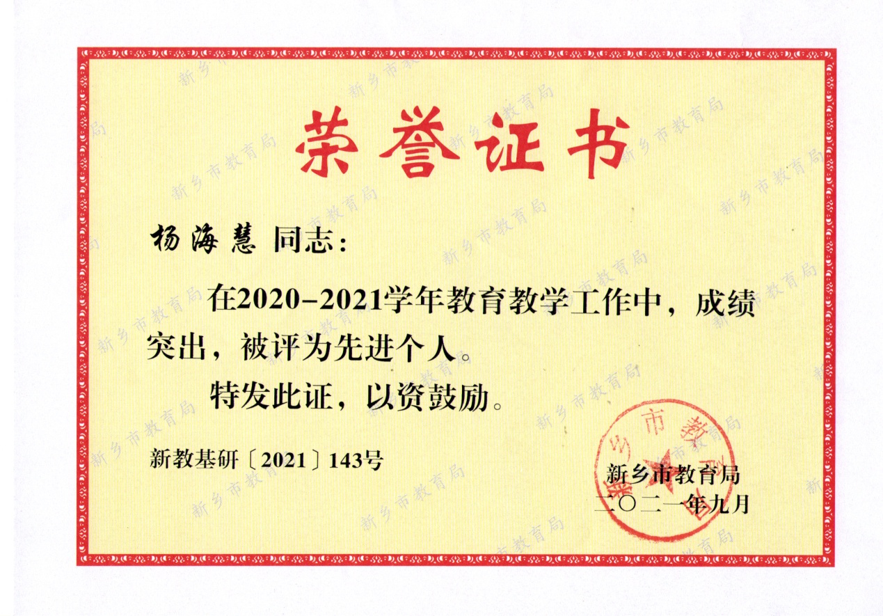 学年教育教学工作中,成绩突出,被新乡市教育局评为先进个人。