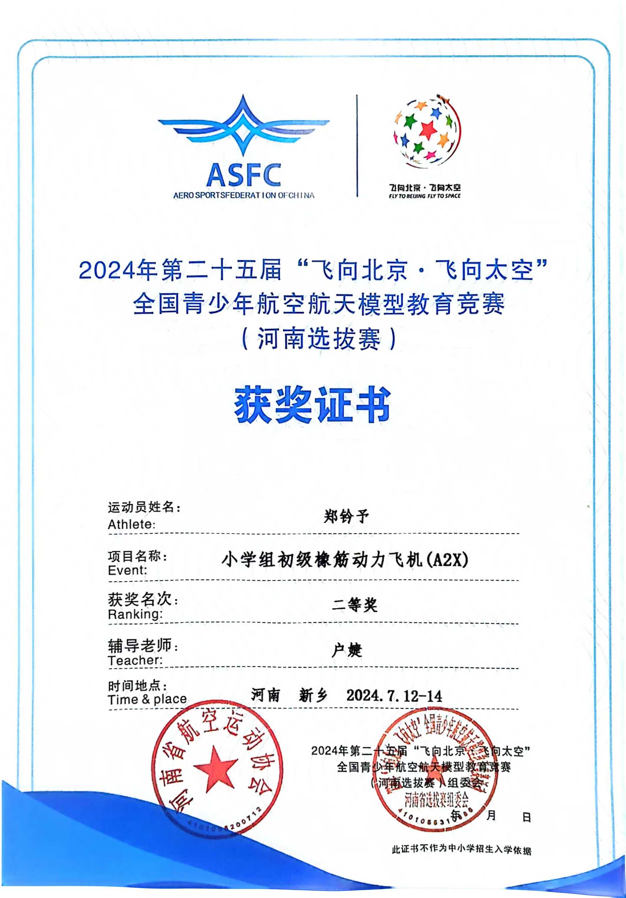 在2024年第二十五届“飞向北京·飞向太空”全国青少年航空航天模型教育竞赛(河南选拔赛)中,户婕老师指导的邱之洲、郑钤予、崔梓烁、王安宇、朱煜诚获得优异的成绩。