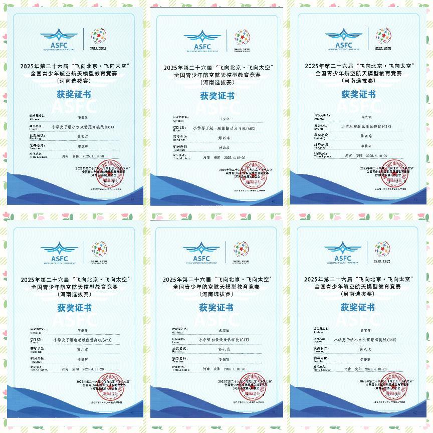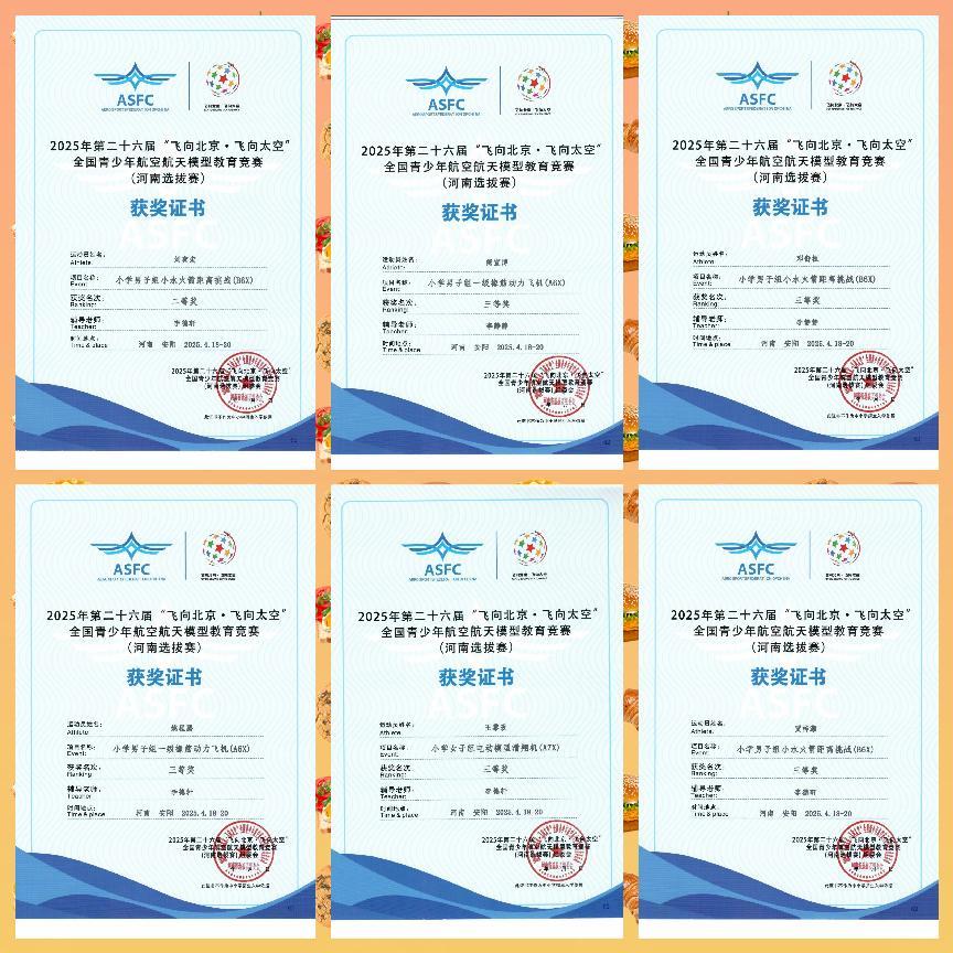 经过激烈角逐,河南师大学附属小学代表队凭借扎实的科技素养和出色的临场发挥,斩获多个竞赛项目奖项:王安宇在“小学组初级线操纵特技(C1X)”项目中以45秒3个气球全部爆破的满分成绩斩获一等奖第一名;邓舒桓在“小学男子组初级橡筋动力飞机(A5X)”项目100多人的比赛中斩获一等奖第一名;。
