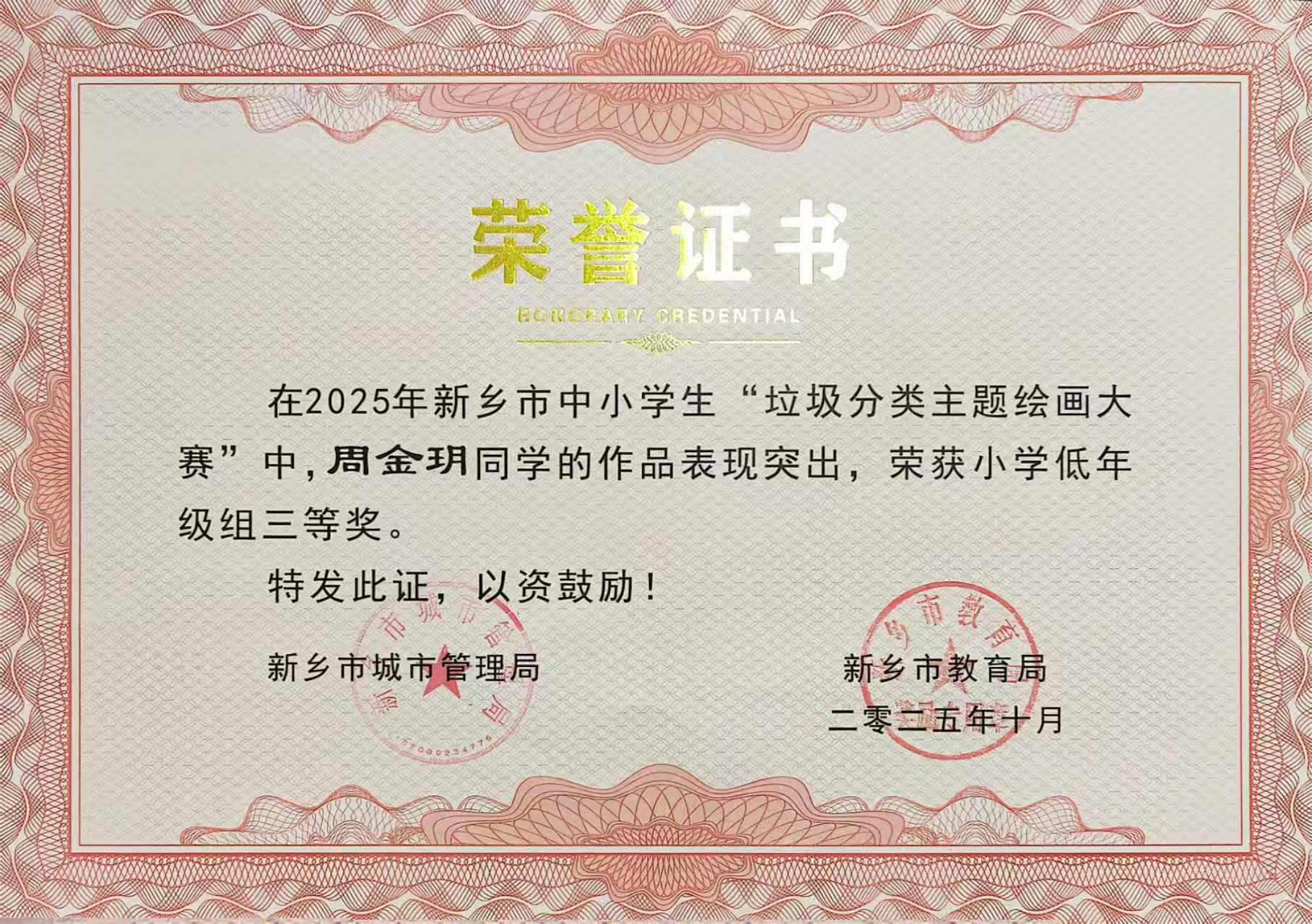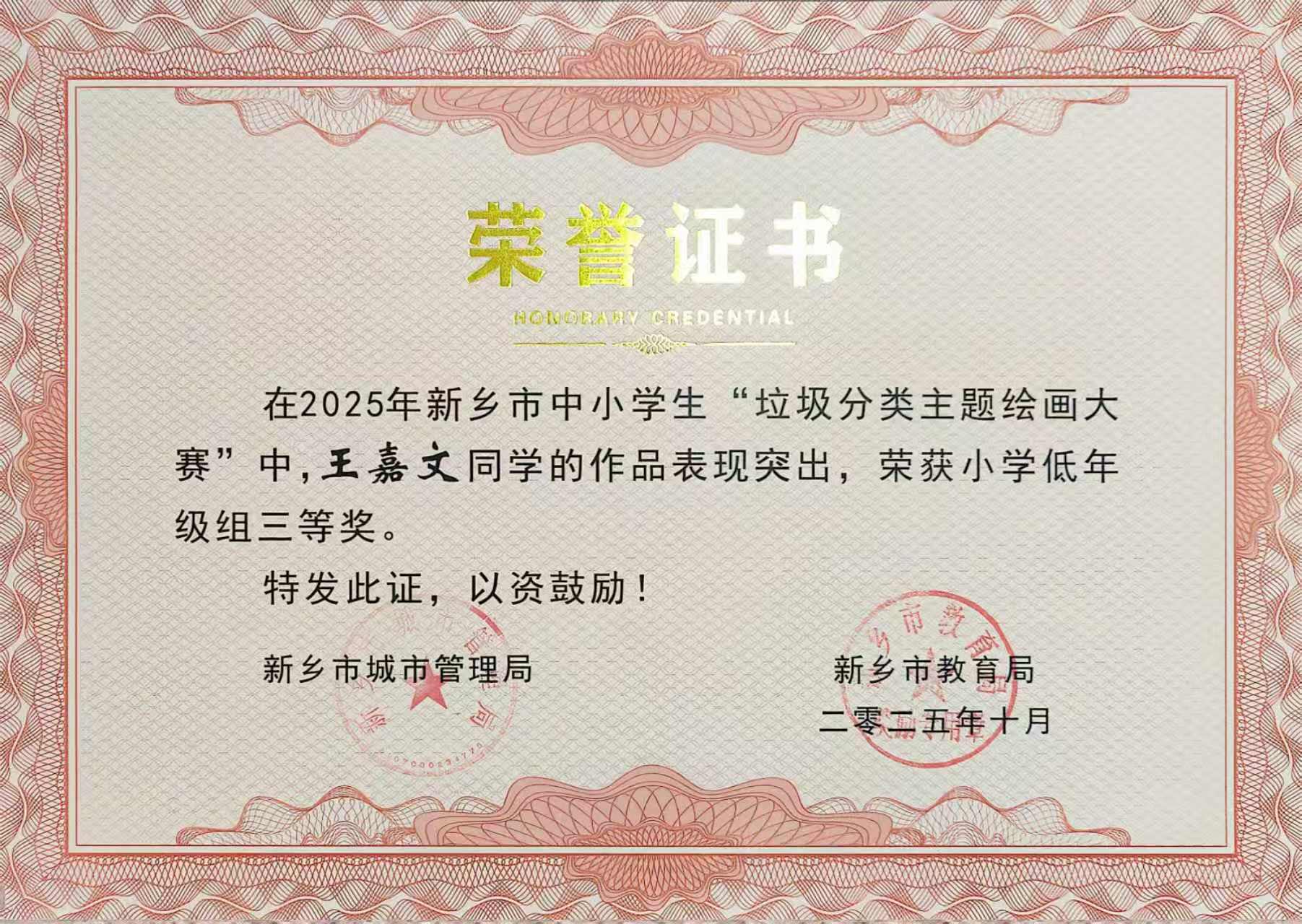 在2025年新乡市中小学生"垃圾分类主题绘画大赛"中,赵婧睿同学的作品表现突出,荣获小学低年级组等奖王嘉文、周金玥同学作品荣获小学低年级组等奖赵妍老师被评为优秀指导教师。