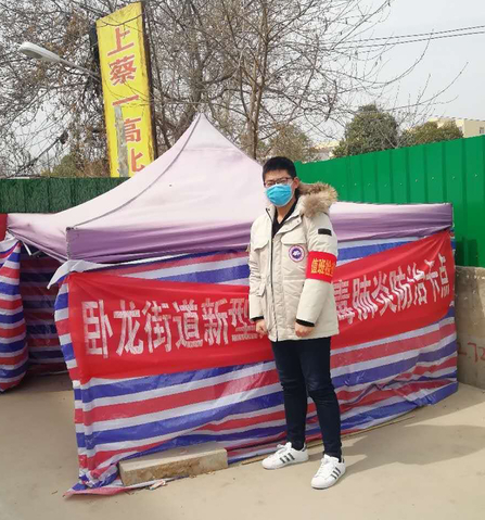 灾情就是命令,时间就是生命,上蔡县拥有一百五十多万居民,而且外出打工人口流动较大,防疫形势十分严峻。曹乾同学主动向社区提交申请,积极参与到社区防疫工作中,为街坊邻居和父老乡亲站好第一班岗。
