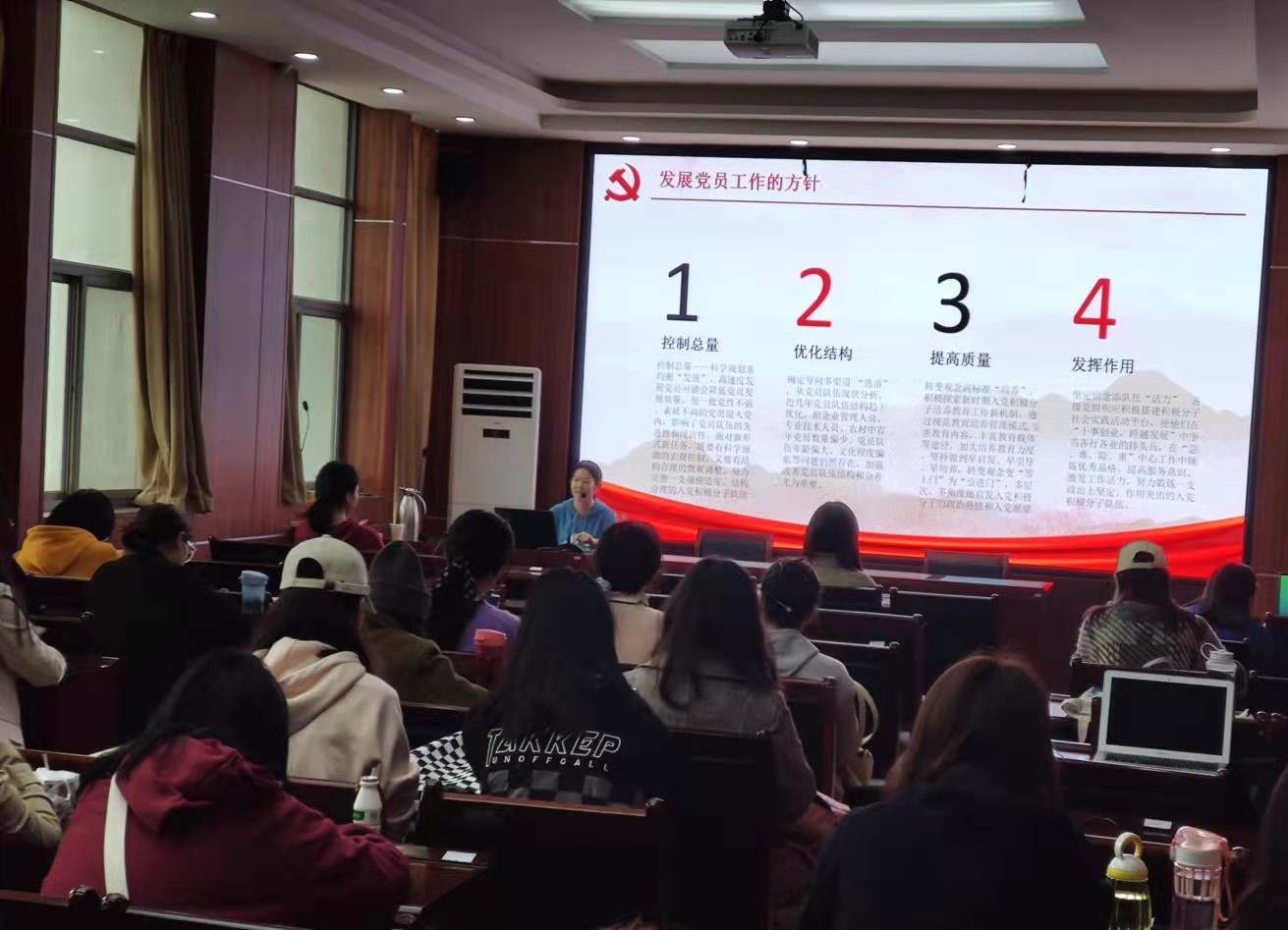 首先,柴舒婷介绍了中国共产党的性质、宗旨和主要指导思想,并对入党誓词进行了详细阐释,鼓励同学们积极学习党的先进理论、充分了解党的历史、培养知党爱党的内生动力。她分别从控制总量、优化结构、提高质量、发挥作用四个方面剖析新时期发展党员的工作方针,指出发展党员工作事关党的事业兴衰,关乎党的生命力,具有重要意义。柴舒婷强调:严格、规范的程序是提高党员质量的重要保障,并以我校党员发展工作为例,将入党程序娓娓道来,激发了同学们的浓厚兴趣。最后,她将党章中规定的党员义务与研究生学习生活的实际情况相结合,就如何成为合格共产党员提出中肯建议。