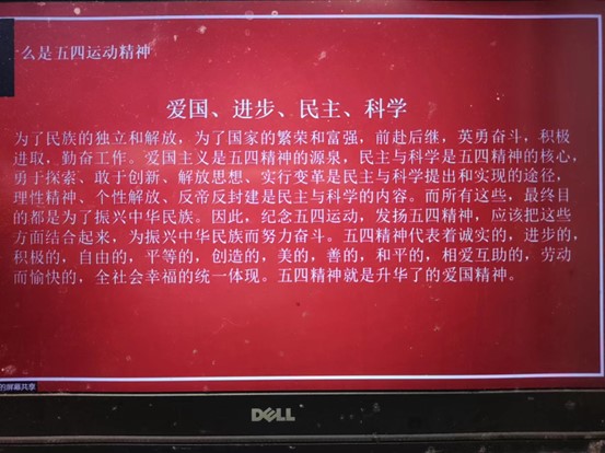随后,郜麟璐为同学们深刻讲解了五四运动精神的内涵和意义。郜麟璐指出,爱国是五四精神最根本的精神;进步是五四精神的灵魂;民主精神是五四精神的核心;科学精神是五四精神的基本内核。最后,她强调,爱国主义是五四精神的源泉,民主与科学是五四精神的核心。因此,纪念五四运动,发扬五四精神,应该把这些方面结合起来,为振兴中华民族而努力奋斗。