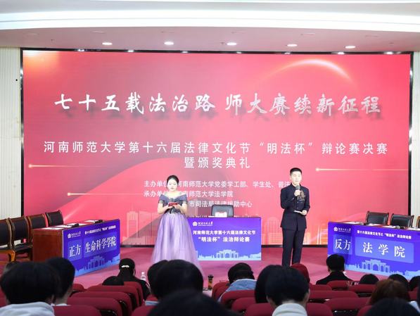 12月4日下午,由河南师范大学党委学工部、普法办主办,河南师范大学法学院、新乡市司法局法律援助中心承办的十六届法律文化节“明法杯”法治辩论赛决赛暨颁奖典礼于东校区思政平台举行。法学院党委书记张壬,党委宣传部、党委学工部、校团委相关负责人,新乡市司法局和师大方正律师事务所代表,各学院(部)副书记、团委书记、辅导员及学生代表参加本次活动。