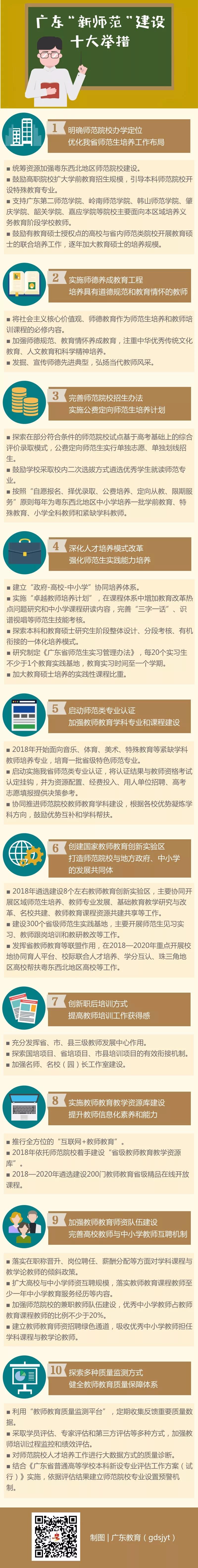 《实施方案》明确到2020年,办好一批高水平、有特色的师范院校和师范类专业,形成在全国具有影响力的教师教育广东新模式,并提出了十大重要举措和三大保障措施。文件要点和原文如下: