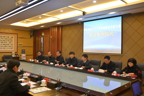 1月19日上午,河南师范大学支持安阳师范学院发展协议签约仪式在勤政楼第三会议室隆重举行。我校党委书记郑邦山,校长常俊标,副校长孙先科、马治军,安阳师范学院党委书记纪多辙,校长黑建敏,副校长杨新新、姚远峰等校领导出席签约仪式,双方相关职能部门负责人参加了签约仪式。