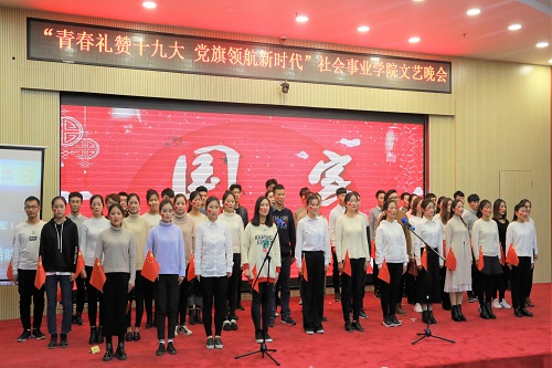 晚会在大家的掌声中拉开序幕,共分为“重温十九大,不忘最初心”、“走进新时代,开启新篇章”、“青春筑梦时,社院展风采”、“一路高歌唱,携手创辉煌”四部分。