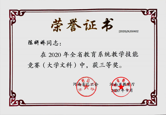 近日,河南省总工会、河南省教育厅举办的全省教育系统2020年度教学技能竞赛结果揭晓,我院副院长陈妍娇参赛《专业英语》获大学文科组三等奖。
