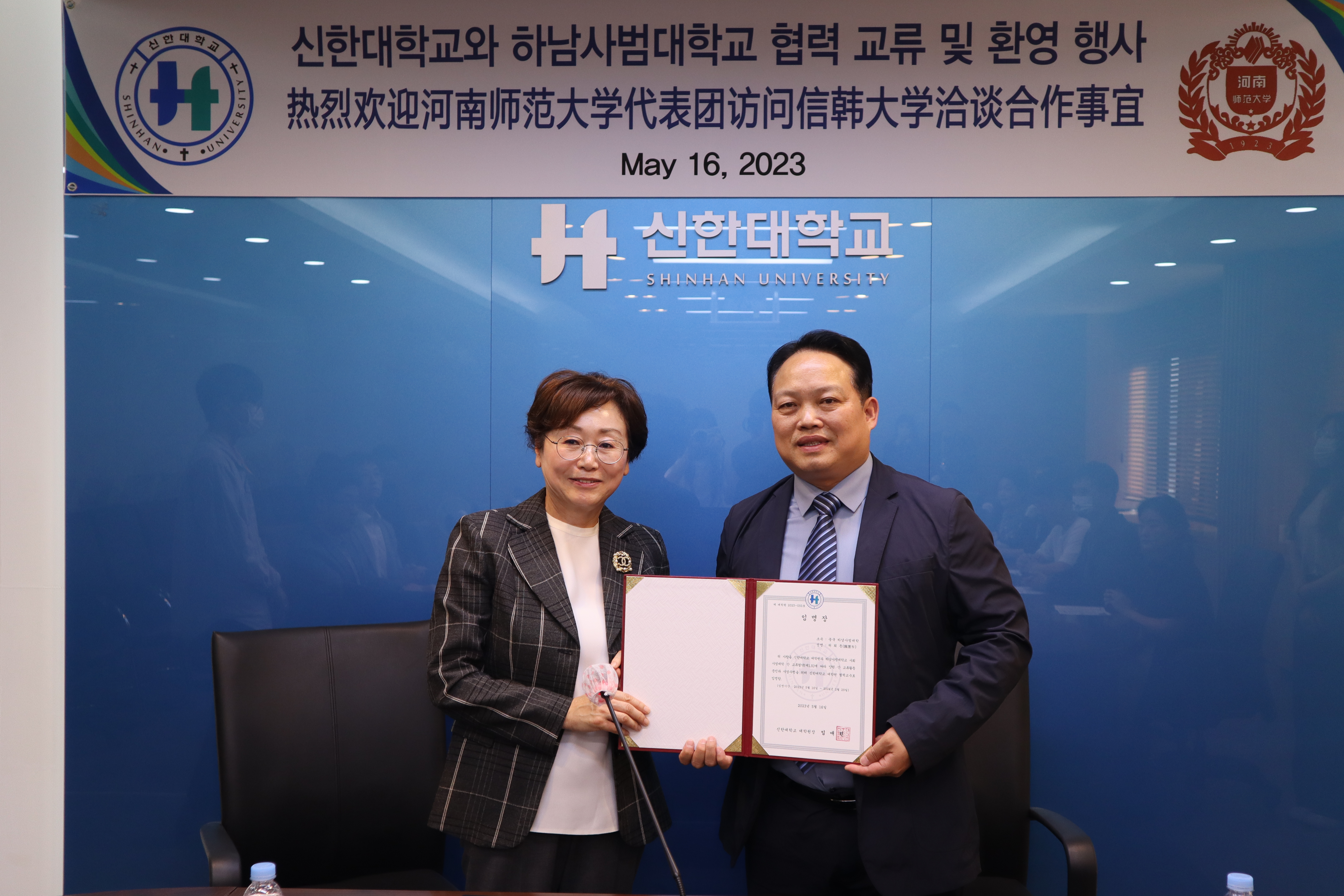 信韩大学大学院与河南师范大学社会事业学院就共建社会福利学科达成共识,举行合作签约和聘任仪式。林爱莲院长与魏雷东院长共同签订《中国河南师范大学社会事业学院与韩国信韩大学大学院合作交流协议书》,并向魏雷东院长颁发合作教授聘书。信韩大学国际交流处为代表团举行短期研修结业仪式,为师生颁发研修结业证书。三所高校社会福利学系知名教授向学院赠送各自最新出版的学术专著和精选教材,并就国际一流师资互聘进行磋商。代表团举行专场博士招聘会介绍学校优秀博士人才引进政策,并与在韩博士留学生进行交流座谈。