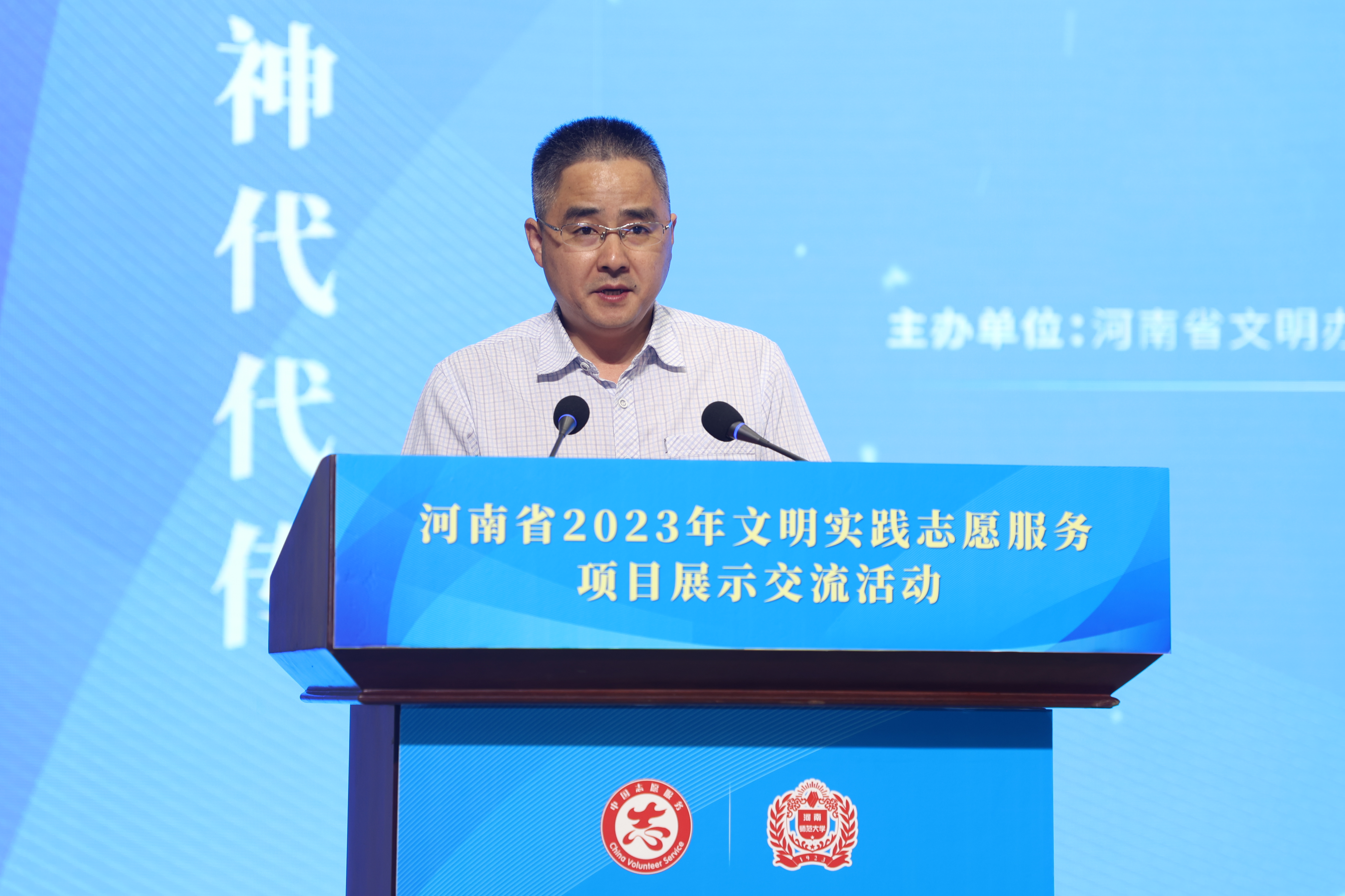 王勇代表新乡市委宣传部致辞,介绍了新乡市近年来以新时代文明实践与志愿服务工作为抓手,加强公民思想道德建设、深化文明城市的经验做法。他指出新乡是志愿者之城,志愿红是文明新乡最靓的风景,新乡市委宣传部全力支持新时代文明实践阵地建设,将联手河南师范大学共同开展专项课题研究、培养更多专业人才、孵化更多品牌项目,更好地推动新乡市文明实践志愿服务事业发展。