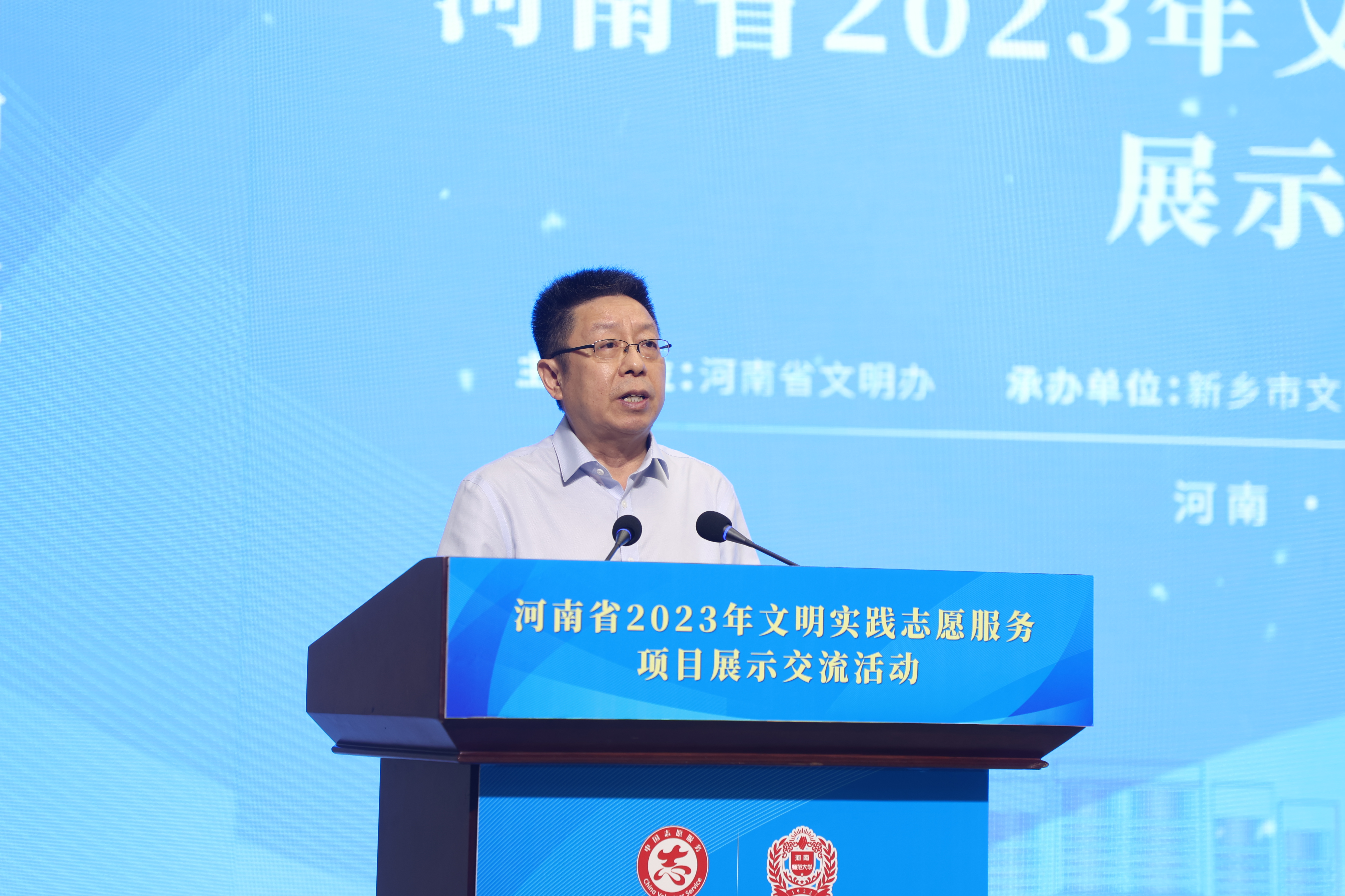 杨恒智代表河南省文明办致辞,感谢新乡市文明办与河南师范大学为本次展示交流活动精心筹备和周到服务。他指出,近年来我省文明实践志愿服务事业取得的新进展,志愿服务带动力显著增强、志愿服务项目化成效明显、新时代文明实践建设稳步推进、志愿服务保障不断强化,有助于全面推进我省社会治理效能增强。他强调,各地新时代文明实践阵地负责人和志愿服务团队(组织)需要切实推进志愿服务项目化,精准满足群众需求,丰富志愿服务菜单,加强培育扶持项目机制,强化相关政策保障。