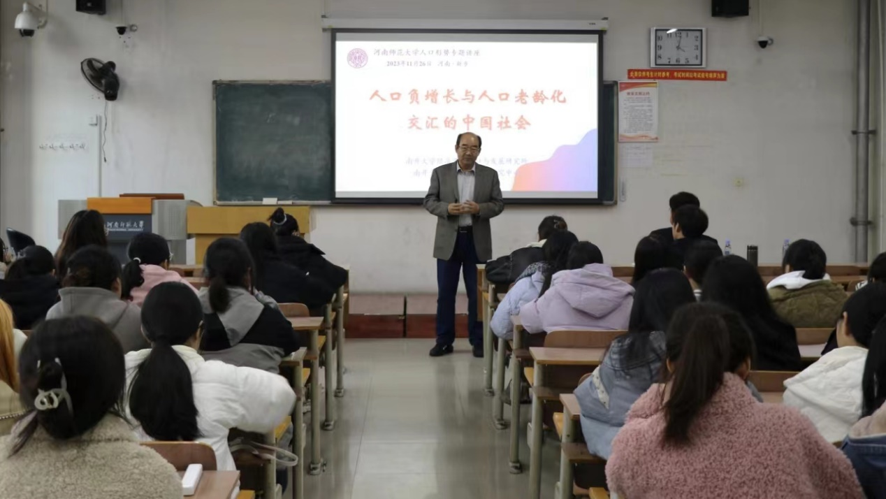 11月26日,应社会事业学院邀请,中国人口学会副会长、南开大学原新教授于求是中楼201教室开展题为“人口负增长与人口老龄化交汇的中国社会”的讲座,讲座由副院长海龙主持。