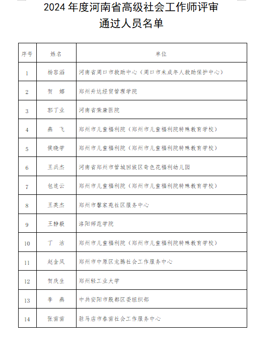 日前,河南省人力资源和社会保障厅发布了《2024年河南省高级社会工作师职业资格评审结果公示》,我院校友2021级社会工作研究生,现任职驻马店市春苗社会工作服务中心的张苗苗,以及我院实习基地督导行业导师河南省荣康医院康复社工科副科长郭丁业分别通过评审。