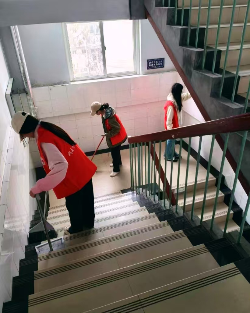 活动当日上午10点,志愿者们准时在东三宿舍楼前集合。领取清洁工具后,大家迅速奔赴各自“战场”,一场热火朝天的清洁行动就此展开。分工明确的志愿者们,有的手持扫帚清扫楼梯、走廊,有的拿着抹布擦拭扶手、门窗,还有的认真清理公共区域的垃圾和杂物。经过近一个小时的辛勤劳作,东三宿舍楼的公共区域旧貌换新颜,环境得到显著改善。