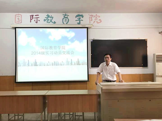 5月10日下午,国际教育学院在多媒体教室举行实习动员交流会。国际教育学院副院长刘海涛、2014级班主任杨东伟、2015级班主任陶宁、团委书记韩舒出席活动,2014级有意向实习的学生参加交流会。