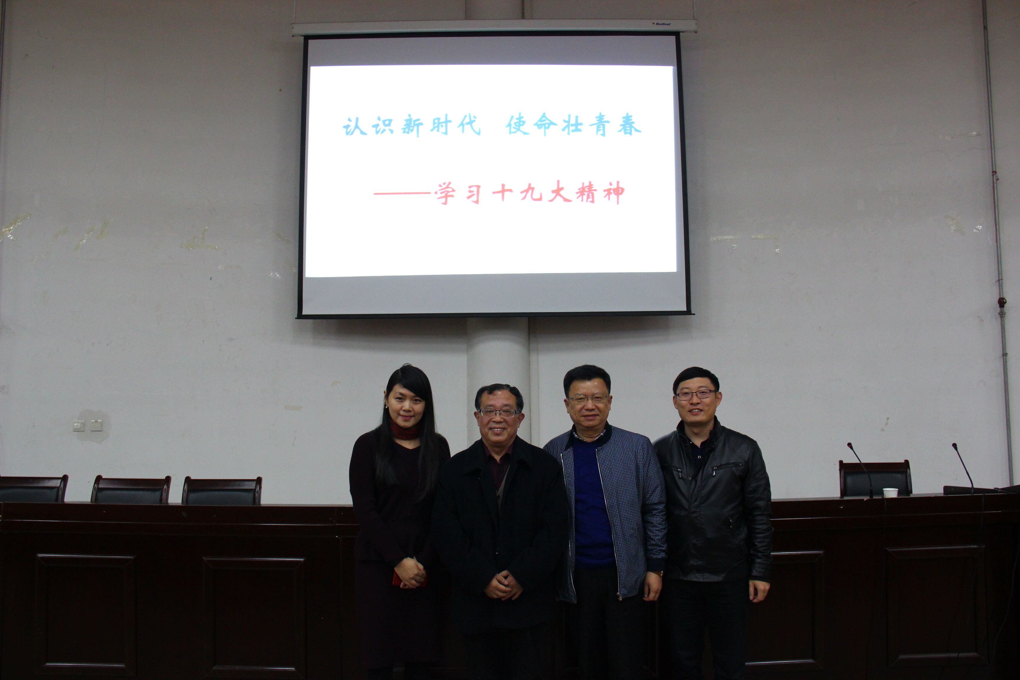 讲座开始,罗建平教授首先将十九大精神概括为“六个新”:新时代、新判断、新思想、新目标、新部署、新要求。罗教授通过历史的角度向在座的各位同学介绍了中国特色社会主义发展的进程。其中罗教授就“中国特色社会主义进入新时代”这一点展开了详细讲解,其内容主要为新时代的研判根据、新时代的基本特征、新时代的基本使命。关于新时代的新使命罗教授介绍了新时代为青年一代人提出了实现中华民族伟大复兴中国梦,建设富强民主文明和谐美丽的社会主义现代化强国,让我们民族和祖国真正强盛起来。讲座最后,党总支书记李秋发进行总结并希望同学们作为新时代的青年人,应该“忠诚使命、献身使命、不辱使命”。