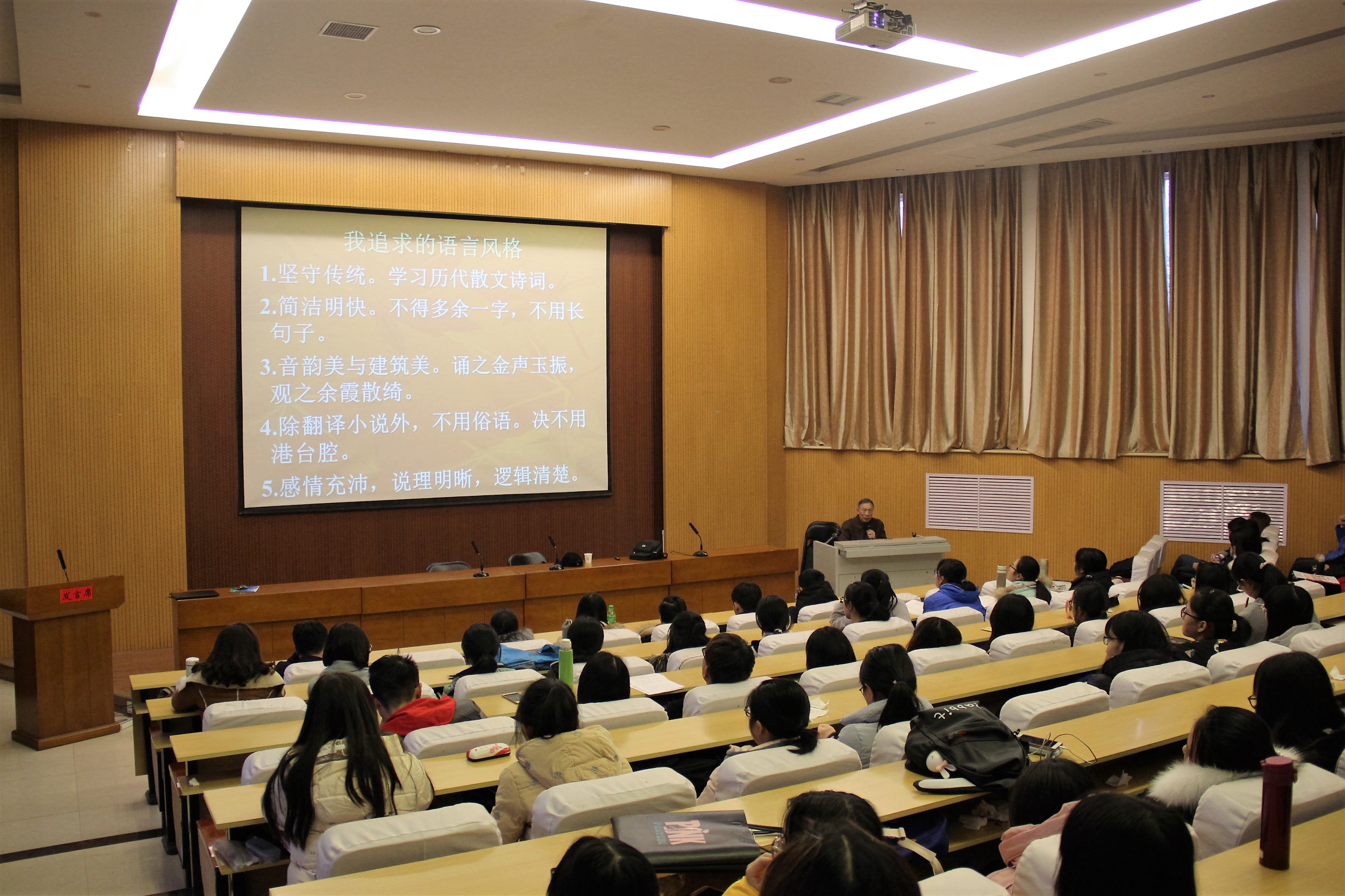 会议伊始,李秋发书记代表国教师生热烈欢迎刘德润教授莅临我院进行专题报告。会上,刘教授通过介绍白川静,林纾等文学大家,阐述了母语学习与外语学习同等重要的观点,表明了培养深厚的文化底蕴在语言学习过程中的重要性。同时,刘教授引用习总书记“民族文化自信”的理论,力争做到将所学知识学有所用,学以致用,使同学们充分认识到汉语在国际语言环境中的重要影响力,激发了同学们在学习外语的过程中对母语学习的积极性和持续性。接着,刘教授从自身追求的语言风格和治学出发,从“学好中文、打好专业基本功、选对主攻方向、勤于思考”四个方面向同学们介绍了语言学习过程中应该注意的问题,并且将日语、汉语及其他语种进行平行对比,推敲出了多种语言学习的方法和技巧,引发了同学们的深入思考。另外,刘教授也从历史、文化、文学、艺术等不同角度谈到自己对汉语学习的看法,在丰富同学们课余知识的同时,也使之对中国文化和语言学习有了更清晰,更深刻的认识。最后,刘教授接受了同学们的提问,并逐一回答。