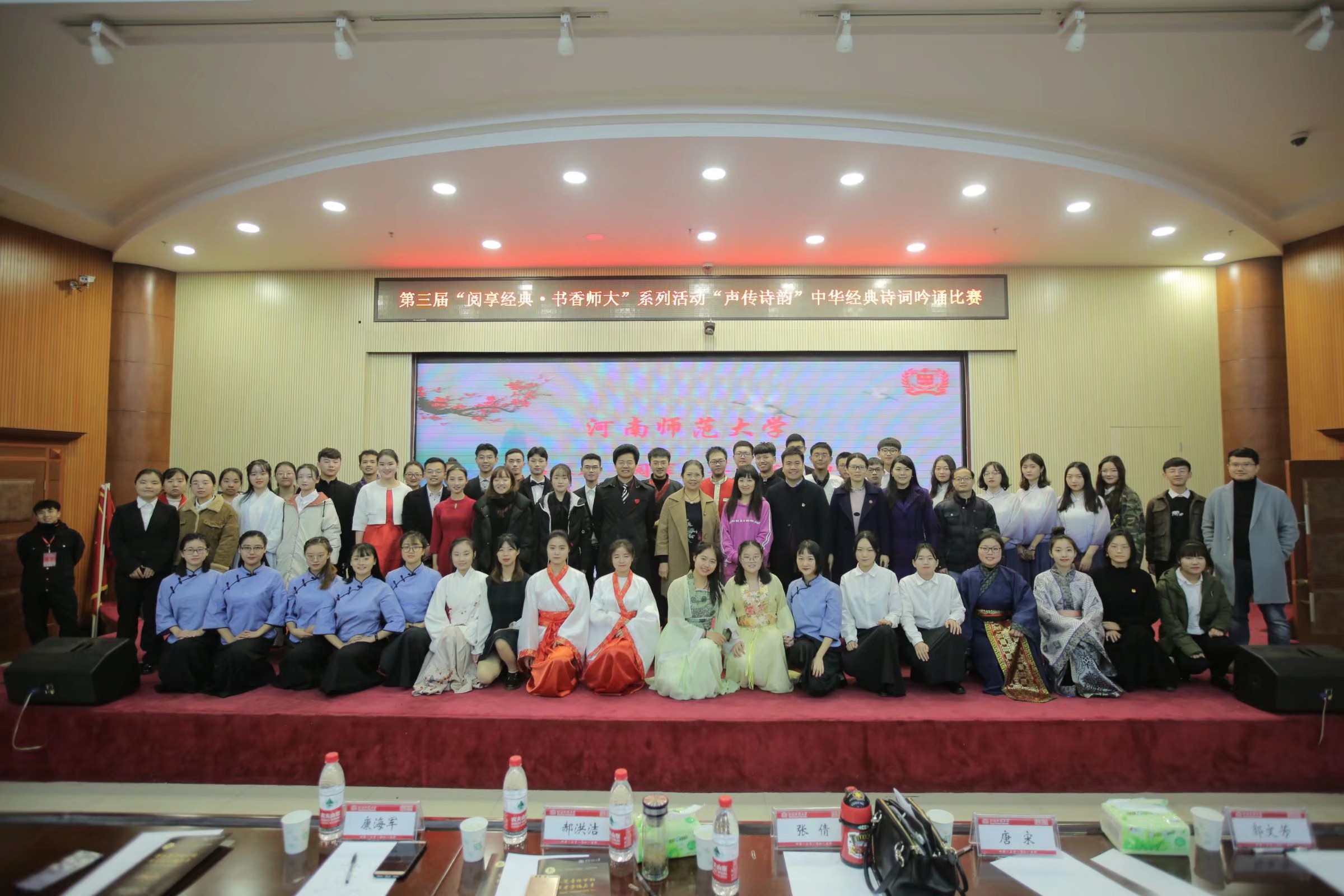 隽永跫音传古韵,莘莘才子诵名章。12月2日上午,由校党委学工部学生处主办、国际教育学院承办的第三届“阅享经典·书香师大”读书系列活动之“声传诗韵”中华经典诗词吟诵比赛在我校思政平台举行。比赛由国家级普通话测试员张倩,党委学工部副部长、学生处副处长康海军,校文化建设办办公室主任唐宋老师,新乡电视台主持人郝洪洁老师,校长办公室副主任郭文芳老师担任评委。来自各学院的老师、学生近三百人一同观看了本场比赛。