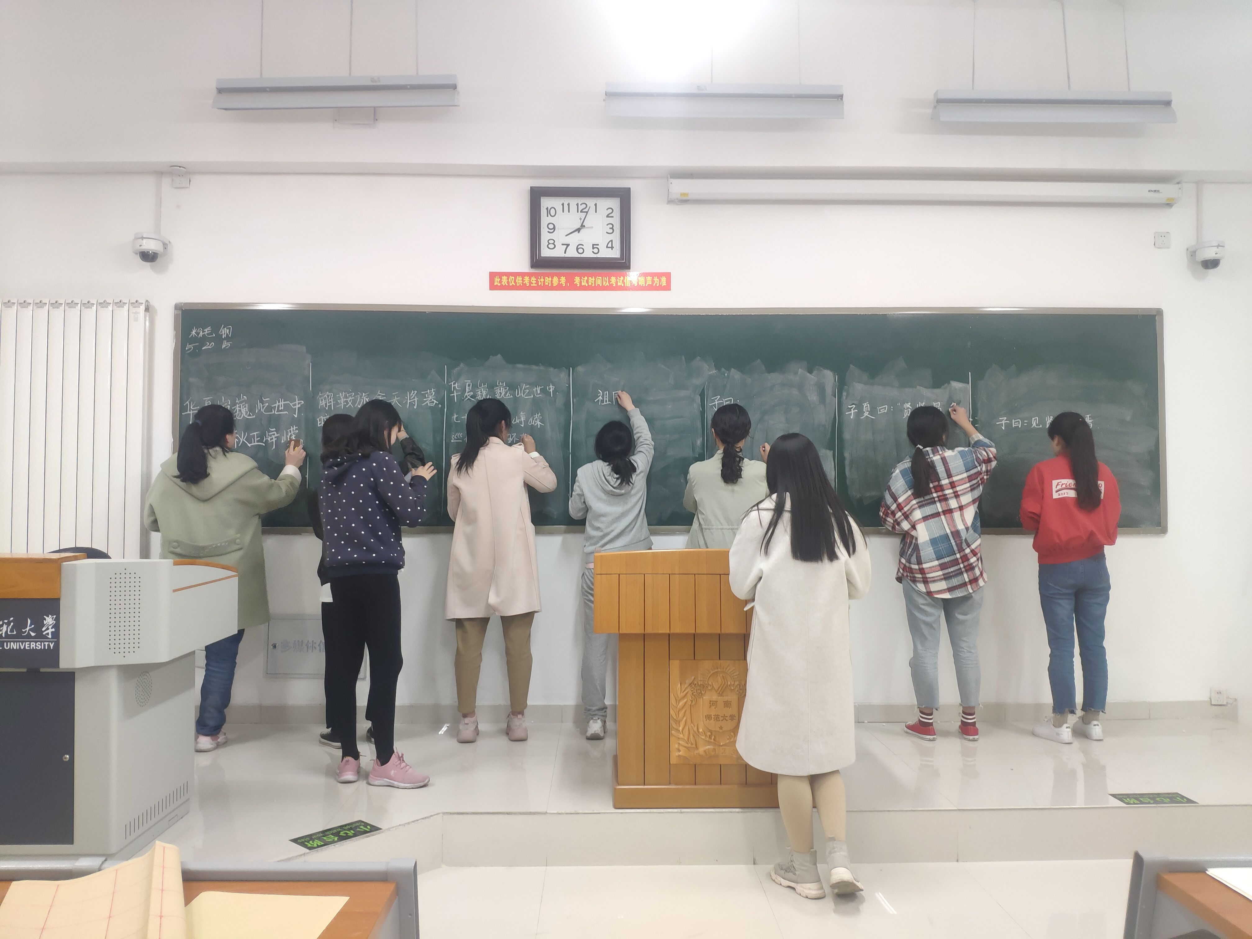 本次比赛包括粉笔字、毛笔字及钢笔字比赛三部分内容,负责人宣读比赛规则后比赛开始,比赛现场气氛活跃,参赛学生认真专注。一根根小小的粉笔在参赛同学们的手中轻舞飞扬、飘逸洒脱。写毛笔字的同学袖子一收,毛笔一挥,字字端庄优美。写钢笔字的同学沉着冷静,手握钢笔,顿收流畅,字字工整美观,一幅幅各具特色的作品从同学们的手中产生了,赛后,负责人对选手成绩进行了登记筛选。本次选拔赛所选拔出的优秀选手将被推荐参加我校三笔字大赛。