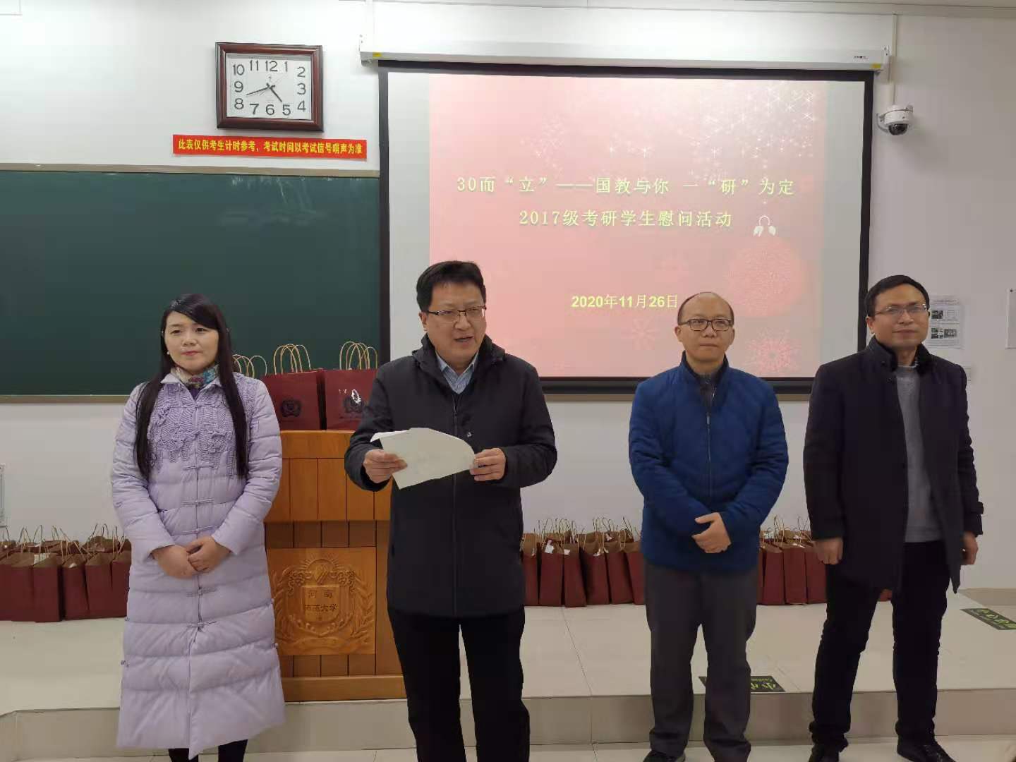 田小勇首先对同学们积极准备,勤奋复习的状态给予了肯定和赞扬,并对考研同学提出了四点建议:既然选择了远方,便只顾风雨兼程;阳光总在风雨后;If you will, you can;考研历程,苦,此生经历,足!最后,他还与同学们一“研”为定:“30而‘立’,祝福同学们乘坐考研这班开往春天的地铁,开启灿烂美好的明天!”随后,董海讲到:“2017级是国际教育学院首届中法合作办学项目的学生,你们身上寄托着中法项目的未来和希望,你们的学业成绩是中法合作办学项目成果的集中展现,祝你们学业有成,都能拥有幸福的未来。”紧接着,刘海涛做出考研寄语:“距离考研30天,希望大家一鼓作气、坚持到底,同时预祝各位同学再次金榜题名、一战成硕!”随后,学院领导为同学们分发精心准备的考研加油包。法语专业学生代表柳怡茗同学说,她很庆幸自己选择了考研这条路,考研过程虽然艰辛,但是有学院的支持和同学们的陪伴,自己一直动力满满,“前进的道路是曲折的,但方向是不断上升的”,坚信曙光就在前方,并对老师们的支持与鼓励表示感谢。