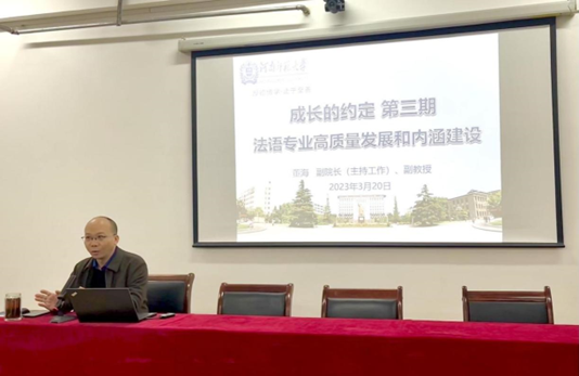 董海院长详细介绍了我校法语专业内涵与特色建设、发展的前景以及中法联合培养项目,帮助法语专业学生指明发展方向,建立清晰的未来规划,促进学生健康发展。他指出,学好外语是提高国际话语权的重要途径,要具有国际视野,掌握多语种技能,赴海外求学的同时,也要将中华优秀传统文化传播到各国。同时,针对同学们法语学习方面遇到的问题,董海院长从自身经历出发,给出具体的建议,鼓励学生多听法语广播,营造母语环境;多与外教沟通,锻炼口语交际,提高听、说、读、写四项基本技能水平,为将来出国深造与职业发展打下坚实基础。