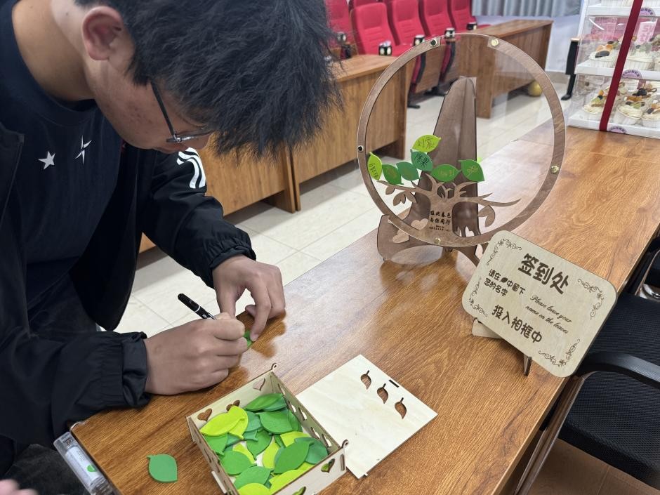 活动以 “成长树签到” 拉开序幕。同学们手持印有绿叶卡片,在签到板上拼出枝繁叶茂的 “成长树”,象征着每位同学在国教院的土壤中 “根系深植,向阳生长”。在 “青春主理人” 分享环节,法语专业刘子尧同学作为代表,通过自己入学后勇敢担任班委,积极参与各类活动的经历,分享了 “主动尝试” 所带来的成长蜕变。当熟悉的生日歌旋律响起,同学们纷纷戴上生日帽,脸上洋溢着幸福的笑容。在全场热烈的掌声与祝福声中,共同分享春日主题的生日蛋糕,并在 “时光胶囊” 许愿仪式中写下自己对未来的期许。互动环节投壶 PK 与口令抢水游戏将现场气氛推向高潮,同学们在游戏中默契配合,教室里充满了此起彼伏的欢笑声。同学收获了 “罐头盆栽” 与 “Better me 星球DIY,既呼应绿植主题,又赋予奖品独特的纪念意义。