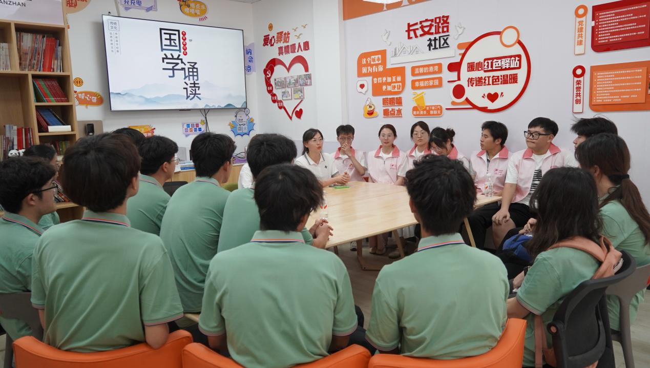俯首基层,情暖民心。座谈会上,长安社区负责人和优秀工作者向同学们面对面传授基层服务经验,为同学们答疑解惑,希望同学们在实践中增长才干、练就本领,不断树牢为人民服务的理念,毕业后在工作岗位上发光发热,为社会主义现代化建设贡献力量。随后,调研团走进社区服务站,与社区孩子们一起参与国学诵读、朗读绘本、体育瑜伽、手工制作等活动,看着孩子们纯真的笑容和社区人们的欢声笑语,让实践队员对“发展好不好,关键看基层”有了切身体悟。