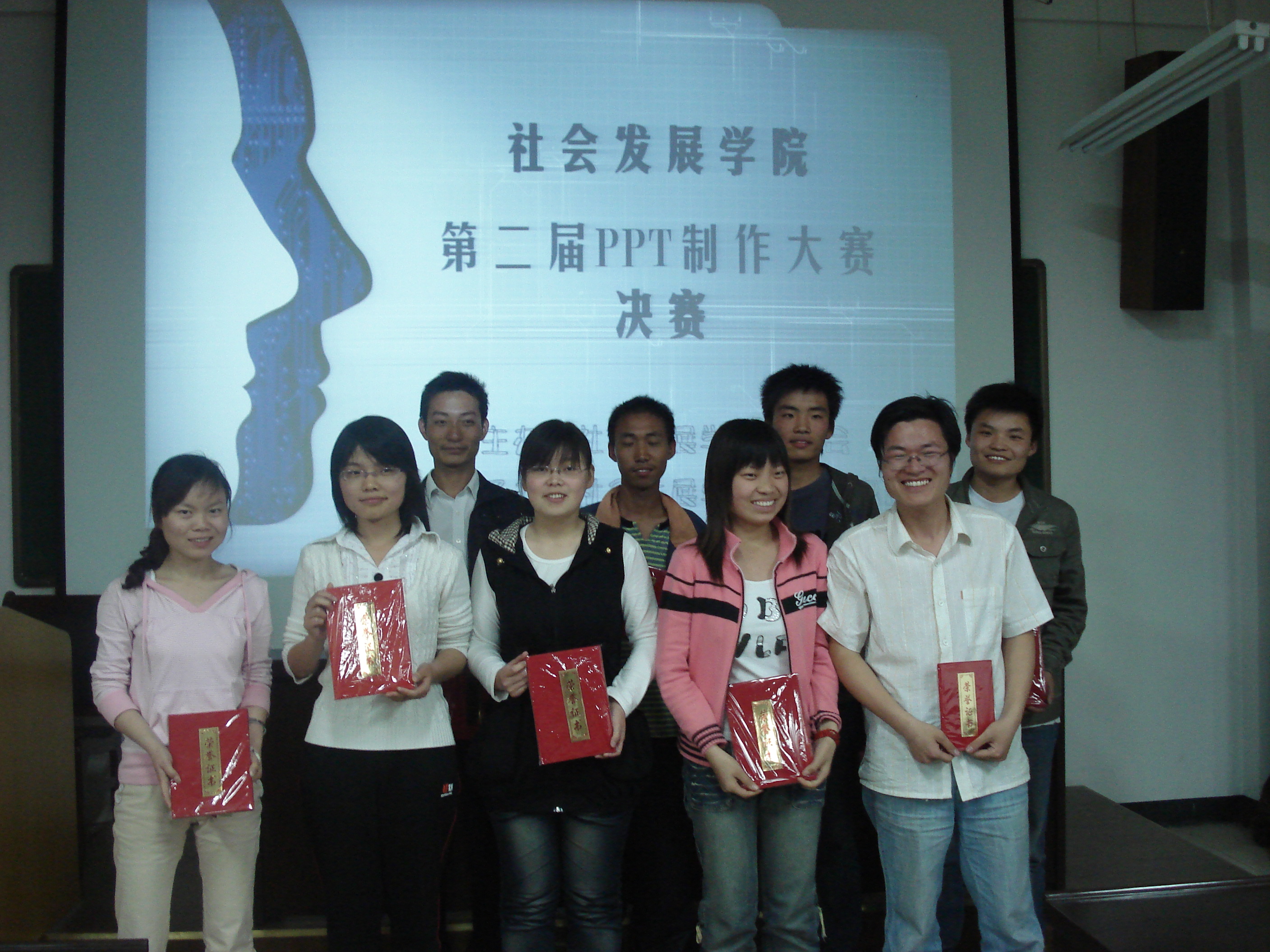 大家在聚精会神的欣赏幻灯片 获奖选手(部分)风采 4月26日晚,社会发展学院学生会网络信息部在我院东区办公楼406学术报告厅进行了社会发展学院第二届ppt制作大赛决赛暨展演活动,近百名学生参与了这次展演。 此次展演共展示了包括06,07,08三个年级的15部优秀作品。本次评比创新了评奖方式:首先在决赛前邀请化学与环境科学学院、政治与管理科学学院、经济与管理学院、美术学院、教育科学学院等五个院的网络信息部部长精挑细选、综合评定,然后由在场的观众当场审核,不符合质量标准的作品将被刷下;以同等年级作品进行评选,尤其对06级要求更为严格。最终产生了15份精彩作品进行展演,它们内容新颖、形式精美、主题广泛,涉及历史、旅游、班级、人生、奥运等多个方面,其精美的制作和近乎完美的放映吸引了在座所有观众的眼球。而其中的一等奖作品《爱――小虎队(MTV)》以其唯美浪漫的动人画面以及歌词与歌曲的完美配合震撼了在座所有观众;另一一等奖作品《开封》则凭借详尽充实的文字介绍与精美诱人的实物图片,使在场观众赞叹连连。本次展演精彩不断、高潮迭起,持续了近两个小时,最终在同学们的喝彩声中落幕。最终经过在做观众审核,评出一等奖两名,二等奖五名,三等奖九名,优秀奖若干。 社会发展学院第二届PPT制作大赛活动共收到作品77份,创造了一个奇迹,大家在制作的过程中体验到了喜悦,学习到了坚持。本次活动极大地激发了大家学习计算机的兴趣,扩充了同学们的视野,将对推动我院的计算机技能的普及起到重要的作用。 (社会发展学院 蒋晋光 李晓宇 张梦仙 李科) |
