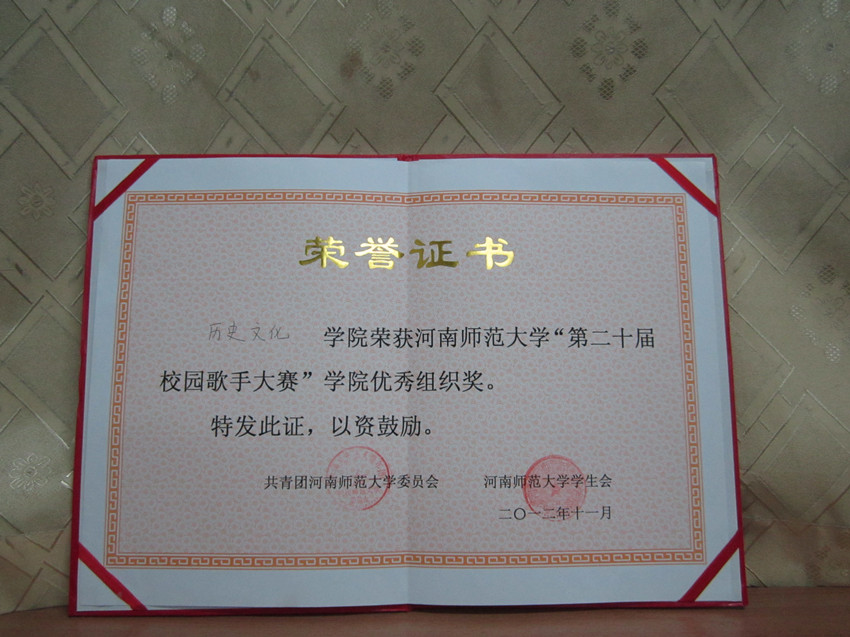 河南师范大学“第二十届校园歌手大赛”学院优秀组织奖