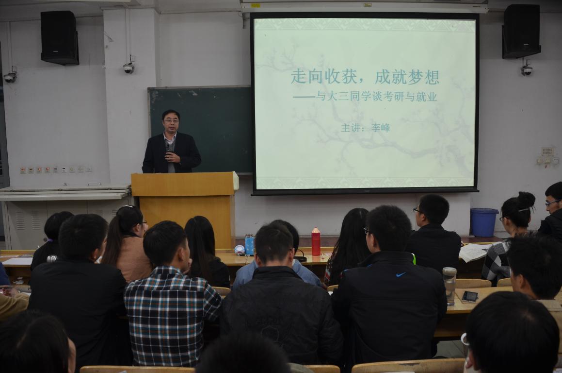 10月29日晚,我在东区A楼203成功开展了大学生职业发展指导站专家讲座活动,副院长李峰应邀为大家作了一场主题为“走向收获、成就梦想—与大三同学谈考研与就业”的讲座,学院200余名同学参加了此次活动。