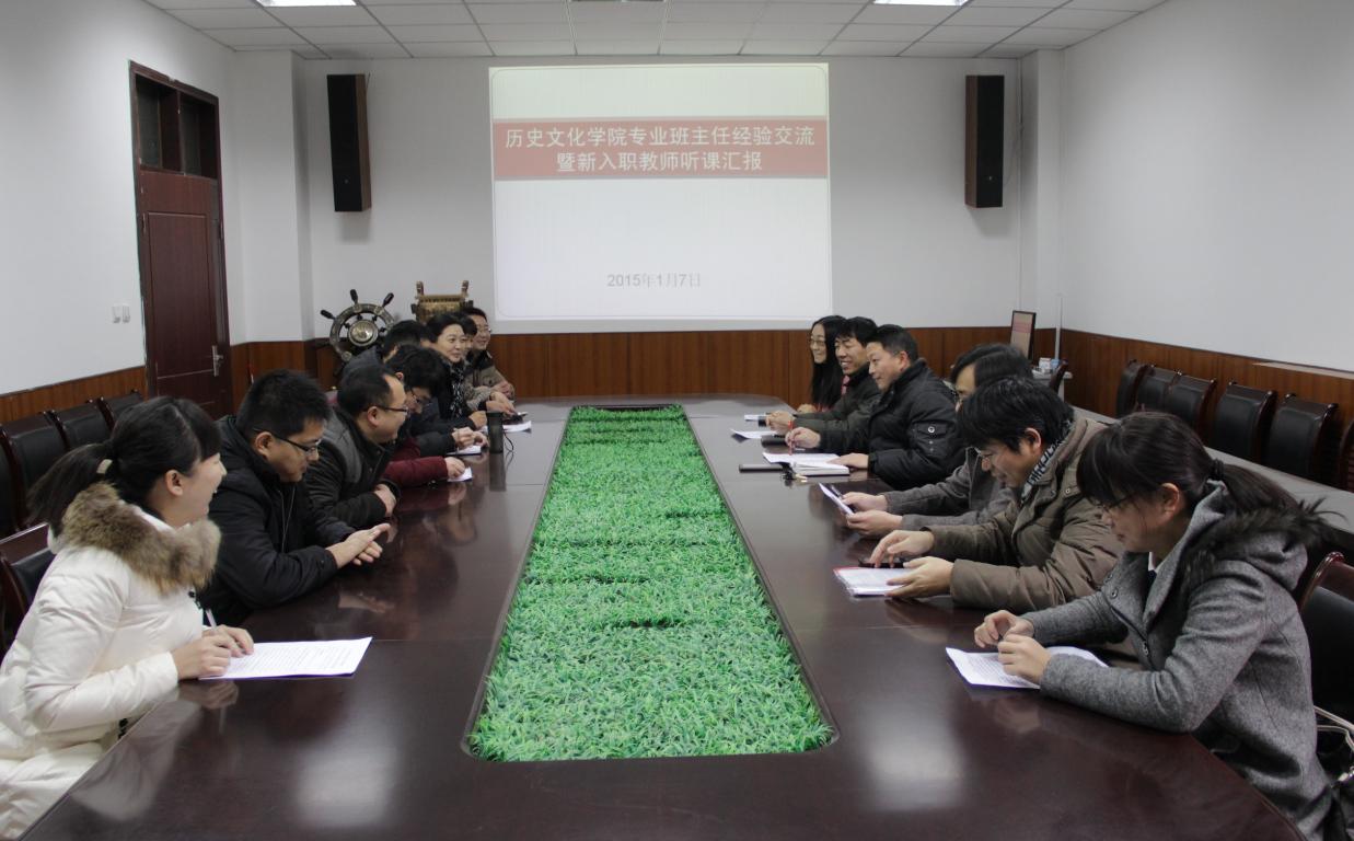 2015年1月7日上午,历史文化学院专业班主任经验交流暨新入职教师听课汇报会在学院二楼小会议室进行,会议由鞠明库副院长主持,2014年新入职的4位教师及2013级、2014级的专业班主任参加会议。