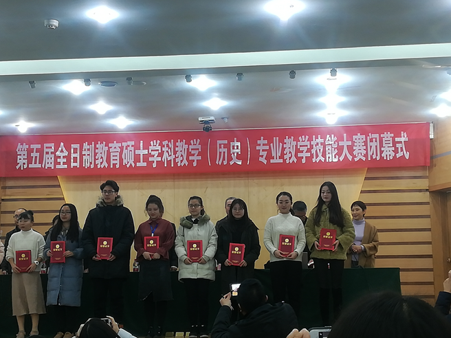 2019年12月13-15日,第五届全国全日制教育硕士学科教学(历史)专业教学技能大赛决赛在曲阜师范大学成功举办,我院学科教学(历史)专业2018级硕士研究生姜雯荣获二等奖、冯思雨荣获优秀教学设计奖,指导老师王守谦教授被评为“优秀指导教师”。