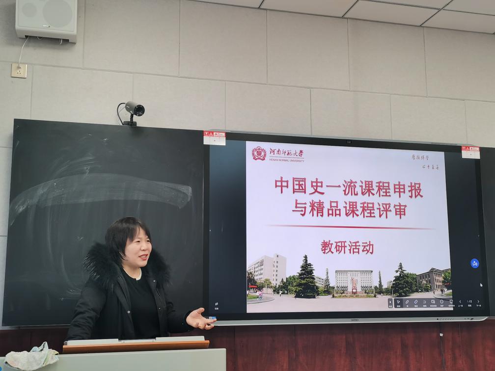 202415日,中国史系组织部分青年教师,首先在学院506智慧教室就中国史精品课程建设进行了展示和研讨。乔传宁博士长期从事中学历史教师“国培计划”和“省培计划”组织者和主要任课教师,首先介绍了教学教法类课程的教学经验,对本科生师范技能培养提出了建议。冯小莉博士是省级创新教学比赛特等奖获得者,展示了她的参赛课程,并结合参赛要求,就课程思政原则在授课过程中的实施路径讲述了自己的心得与体会。马小能博士作为省级一流课程主持人,分享了一流课程的申报过程和经验,并基于我校教学督导要求对青年教师的专业发展提出了建议。