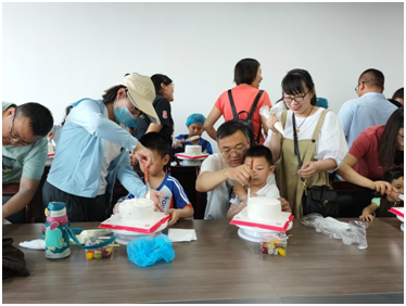 在蛋糕烘焙师的指导和示范下,父母和孩子们一起制作蛋糕,大家充分发挥自己的想象力,用奶油、水果等食材对蛋糕胚进行点缀,活动现场妙趣横生、其乐融融。