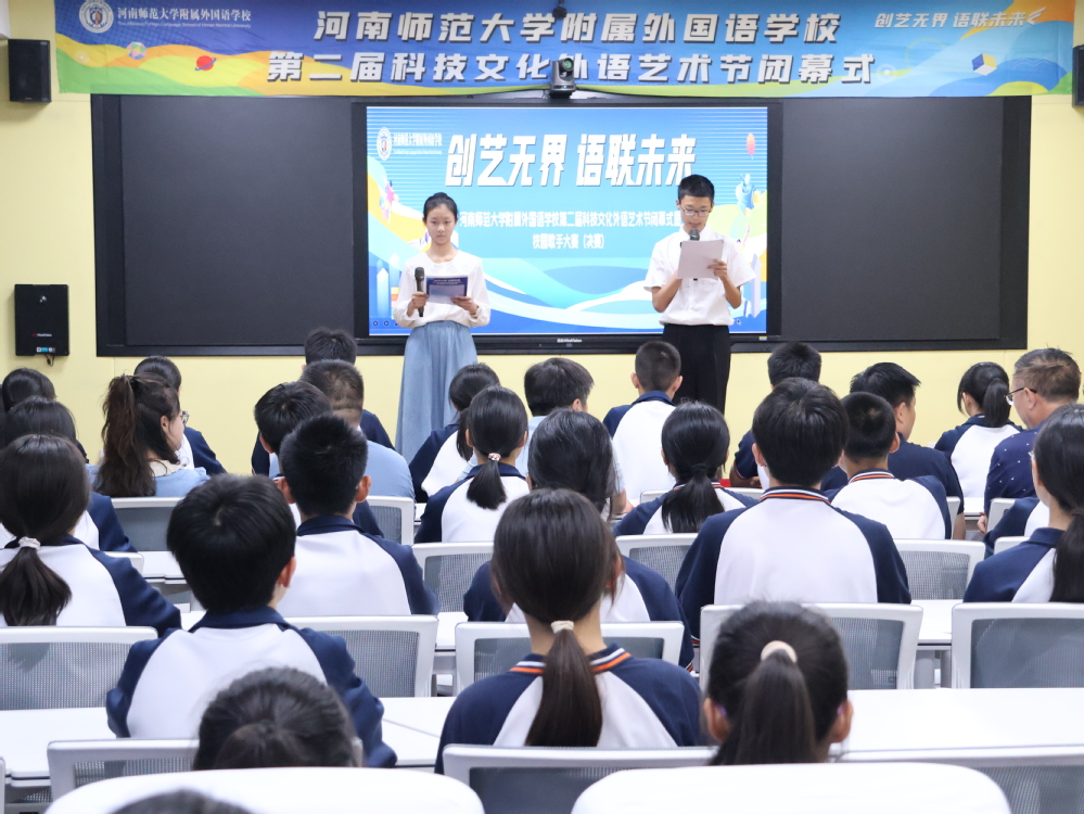 主持人以饱含激情的双语开场白拉开闭幕式序幕,带领师生再次回味这场文化盛会的余韵。