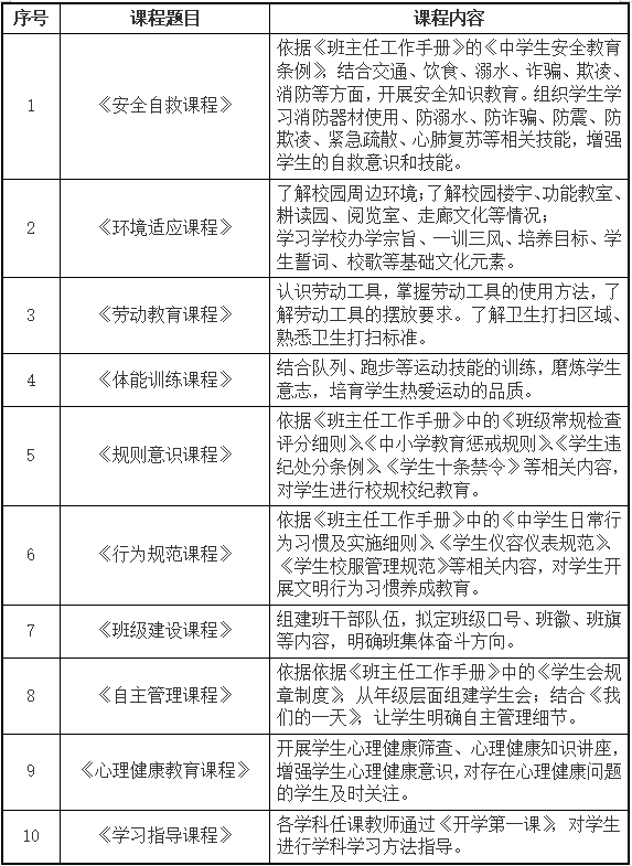 课程实施是实现育人理念的途径。河南师范大学附属外国语学校在开齐、开足国家课程的同时,本着将所有“教育教学内容课程化”的理念,拓宽校本课程建设思路,精心打造了新生入学教育“十大课程”。此课程着力聚焦新生入校学习的重要起点,促使新生尽快适应初中阶段的学生生活,为三年初中生活奠定坚实的基础。