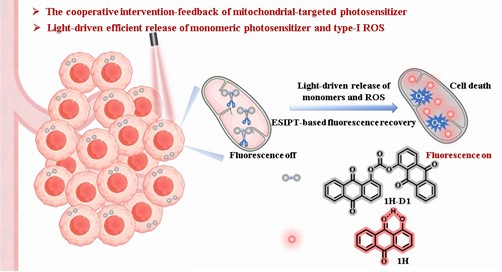 天然产物类光敏剂因其高光敏活性、良好的生物利用度、优异的代谢特性、低毒性以及不易诱发耐药等优势,展现出广阔的临床转化前景。此类光敏剂在提升干预能力的同时,已初步具备监测功能,为诊疗一体化的发展提供了新策略。然而,如何在活体内实现治疗与自报告信号的智能协同仍是当前面临的关键挑战。针对这一问题,研究团队采用聚合与端基修饰的双效协同策略,对源自药用植物的蒽醌衍生物进行结构改造,成功开发出一种新型二聚体蒽醌衍生物。该衍生物具备线粒体靶向能力、光激活特性及光敏性能,可在光照下持续释放单体蒽醌衍生物,并通过I型光化学反应机制产生活性氧,从而显著增强光毒性。与此同时,单体释放过程可恢复其分子内质子转移过程,显著增强荧光,实现治疗过程的实时反馈。研究团队采用理论计算方法,获得蒽醌衍生物的HOMO-LUMO能隙、单-三重态能差以及自旋轨道耦合强度等关键参数,为深入揭示该类衍生物在光物理和光化学领域的特性提供了理论依据。动物实验结果表明此二聚体蒽醌衍生物可有效抑制肿瘤生长,且瘤内荧光强度显著增强,为疗效评估提供直观指导。该研究所采用的双效协同结构修饰策略,为开发高效天然产物类自报告光敏剂提供了重要的设计思路与理论支撑。