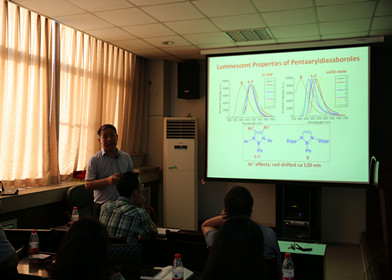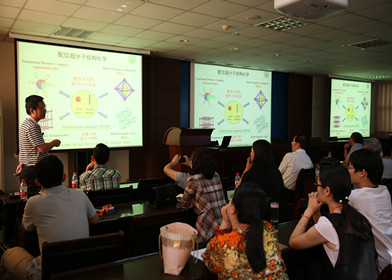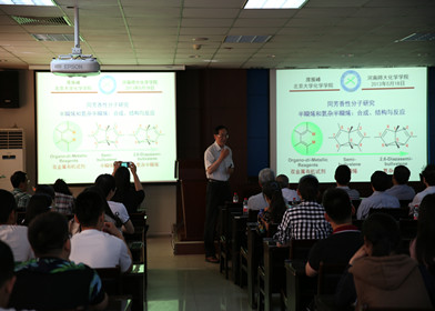 席振峰院士作了题为“双金属有机合成试剂化学与深·新·信”的学术报告,详细介绍了双金属有机合成试剂的发现过程、合成方法及应用领域,并强调了自信和坚持在科学研究中的重要作用,号召在场师生从事科研工作要不断深入、坚持创新、充满自信。席院士的报告逻辑清晰、深入浅出,尤其是他提出的“深·新·信”的科学研究指导思想令在场师生深受鼓舞。崔春明教授作了题为“有机硼烯及芳香体系”的学术报告,详细介绍了硼氮共轭体系的各种效应。苏成勇教授作了题为“配位超分子自组装—金属-有机分子容器与反应器”的学术报告,系统介绍了其课题组在分子容器、分子反应器、均相超分子催化方面的最新研究进展与成果。会后,三位专家同与会师生进行了现场互动交流。
