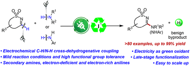 2. Electrochemically driven oxidative C–H/N–H cross-coupling reactions of cyclic sulfamidate imines with primary anilines and secondary amines, Green Chem., 2022, 24, 8377-8385.