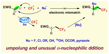 Inverse conjugate additions of acrylic amides and esters with F/Cl/O/N-nucleophiles and CF3+ reagents