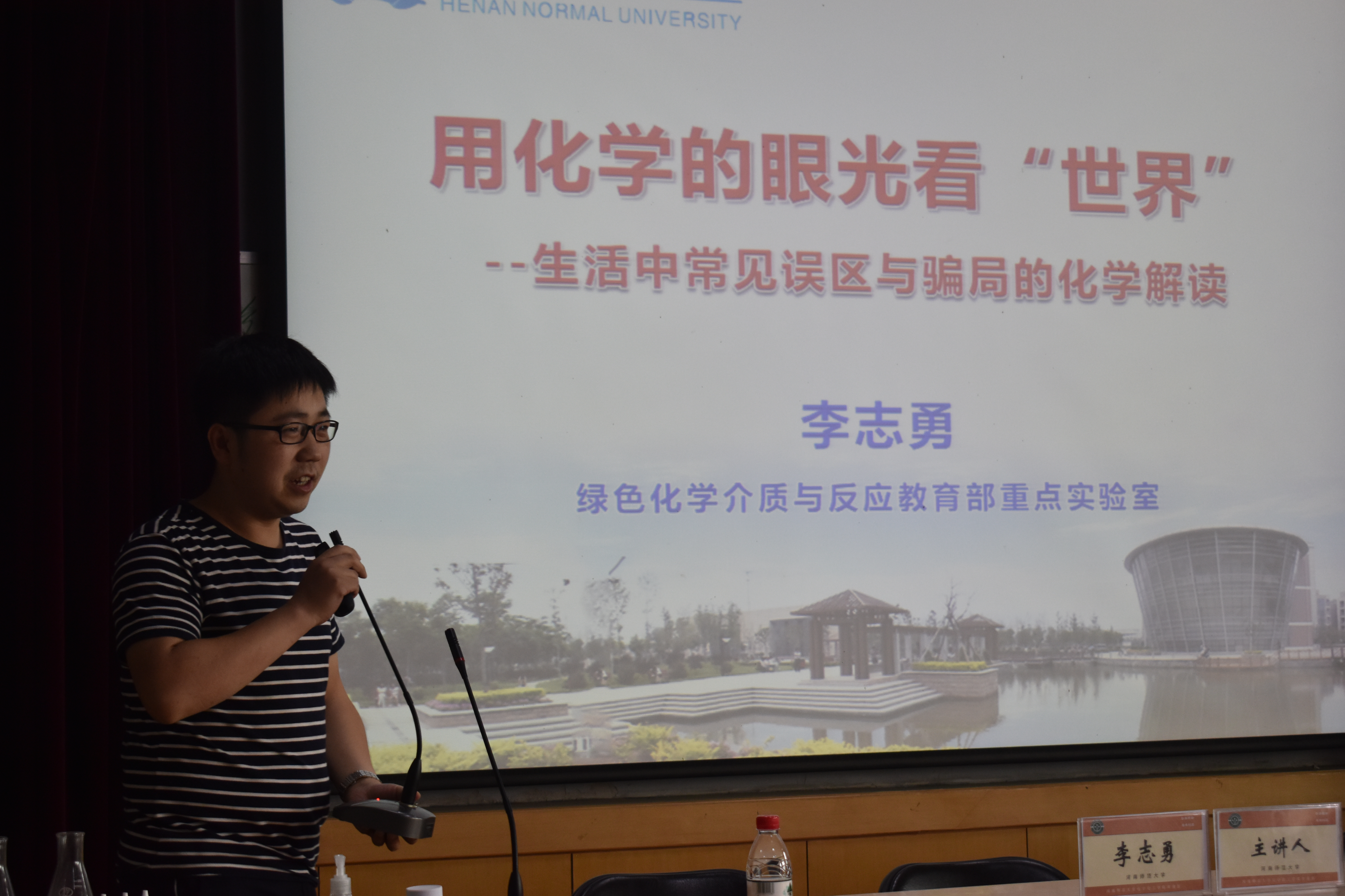 活动伊始,主持人刘起胜介绍出席本次活动的主讲嘉宾,并对他们的到来表示热烈欢迎。王菲菲老师首先利用两种化学物质来介绍自己,富有新意。她还通过视频展示了许多平时肉眼难以观察到的化学现象。通过反应的变化来彰显化学的神奇。李志勇老师则用化学知识为大家解读了一些生活中的常见误区及骗局,表示“化学人应承担社会之责任,用我们自身所学知识去戳穿那些生活中戴着虚伪面具的现象”。整场讲座涉及食品,日用品以及生活常识科普等多个方面,语言幽默,PPT制作精美。两位主讲嘉宾与听众频频互动,现场气氛轻松愉快。“化学究竟是什么,化学为了什么,化学为生命密码解锁,化学让人类的航船奋力扬波”活动最后,刘老师借歌词对本次活动进行总结,愿生活因化学更加精彩。