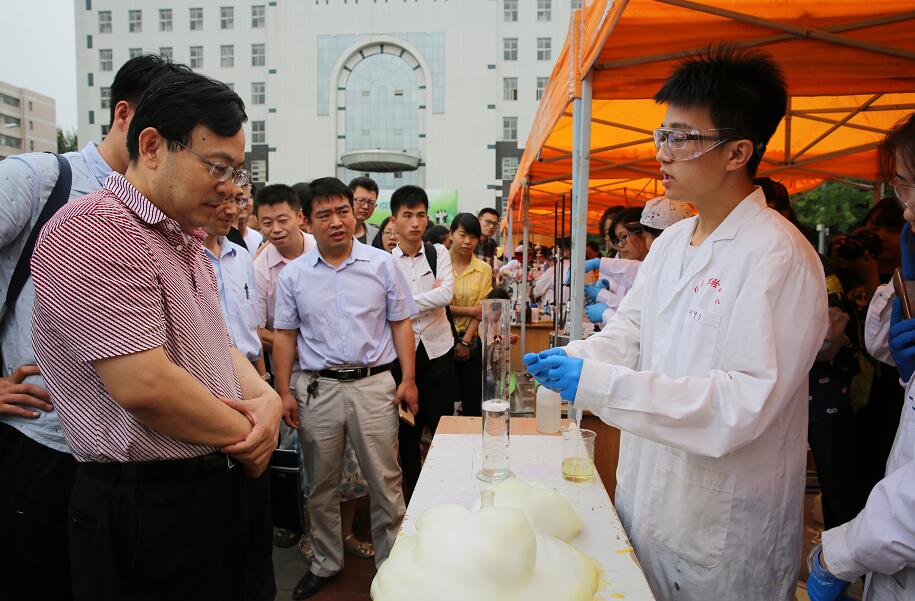 李雪山代表学校对此次活动的顺利开展表示热烈祝贺,向为筹备、组织活动付出辛勤汗水的老师和同学们致以亲切问候。他指出,“魅力化学”科技文化节是拓展第一课堂、丰富第二课堂、体现文化育人的创新载体,是彰显学校和学院办学特色的鲜活窗口,也是校园文化建设的重要组成部分,是贯彻落实全国全省高校思想政治工作会议精神的生动体现。为把这次“魅力化学”科技文化推广日活动办实办好办出成效,李雪山提出了具体要求:要加强宣传,提高认识,营造大学生科技创新活动的浓厚氛围;要拓宽领域,贴近专业,促进校园科技文化活动的常态开展;要积极创新,投身实践,培养服务经济社会发展的高素质人才。