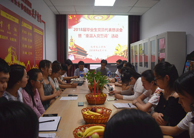 6月11日下午,我院2018届毕业生党员代表恳谈会暨“重温入党誓词”活动在西校区中二楼学生公寓党建工作室举行,校党委委员、院党委书记来俊军,院党委副书记李朝阳,2018届毕业班辅导员和毕业党员代表20余人参加此次活动。